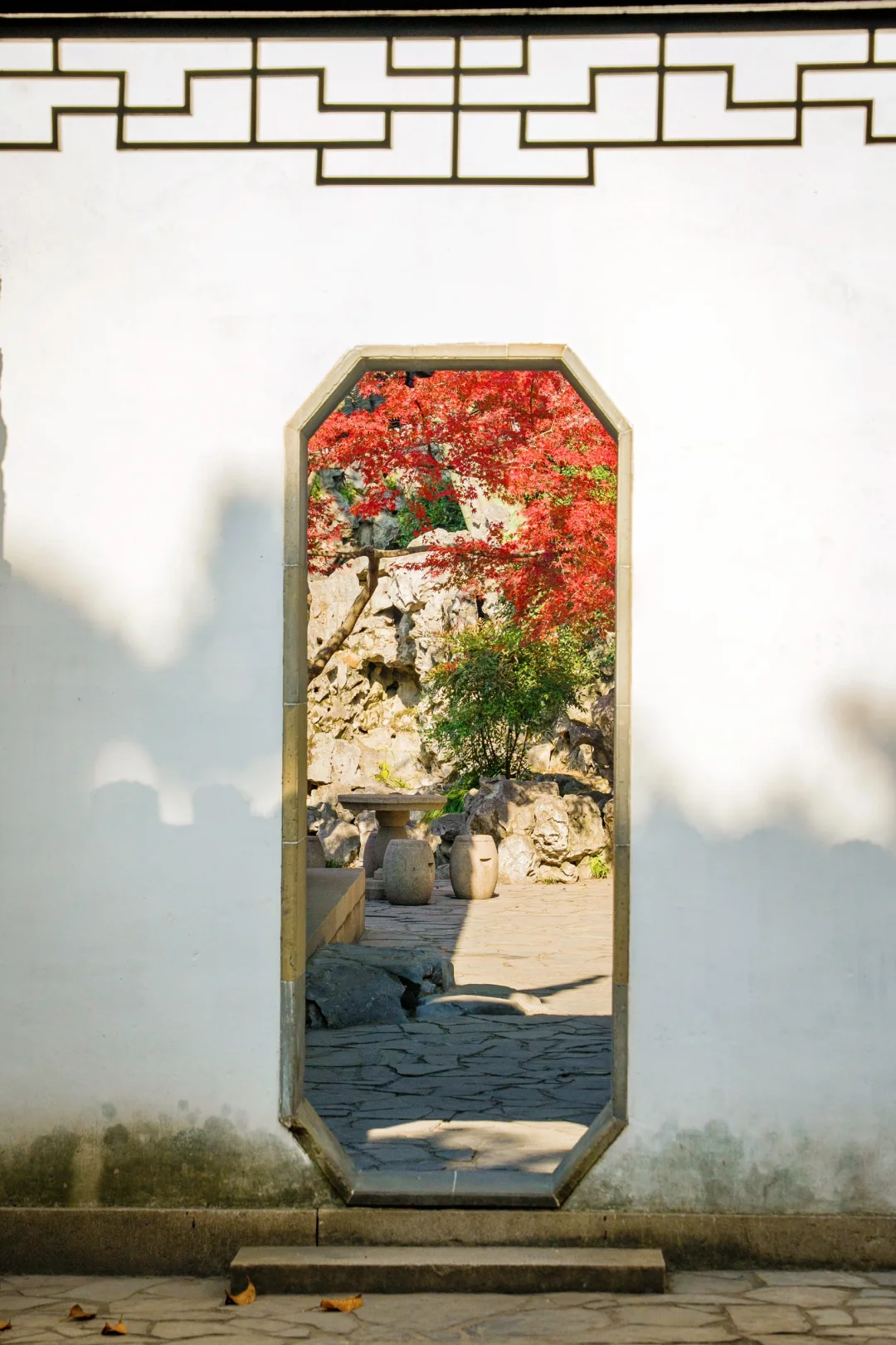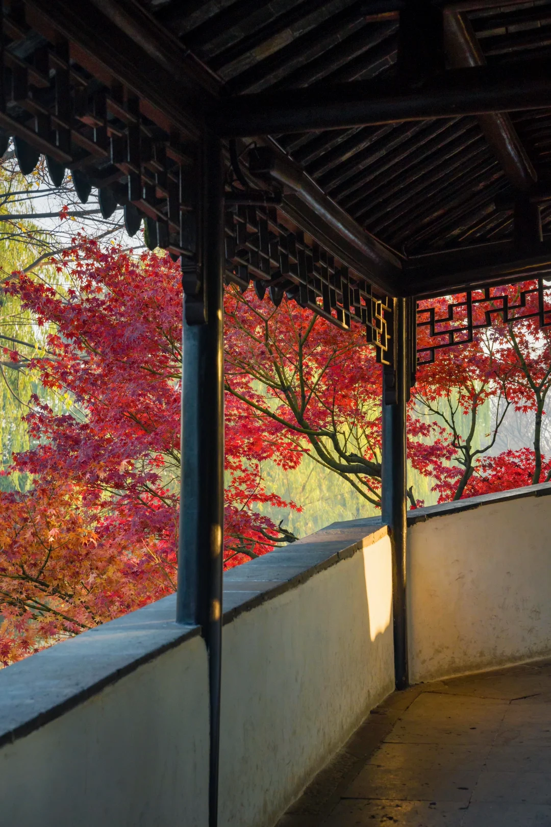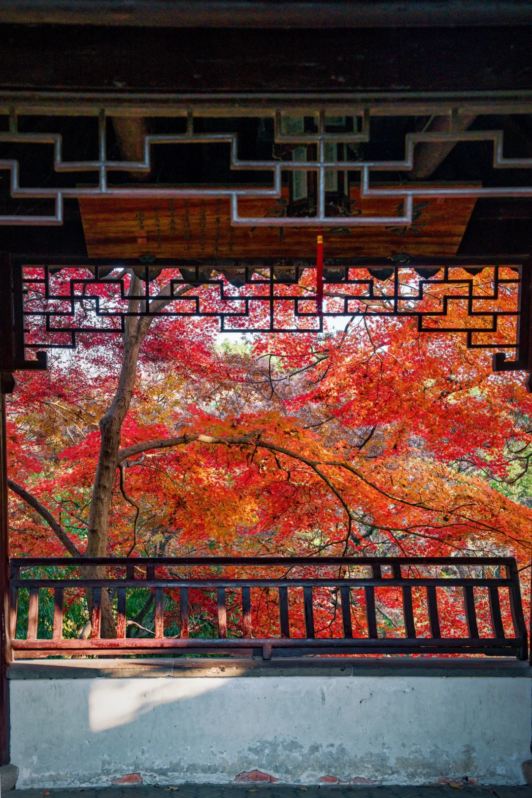 秋日打卡除了百年银杏,还有后山的秋色枫林尽染更是一绝,一步一景的框景尽显中式之美