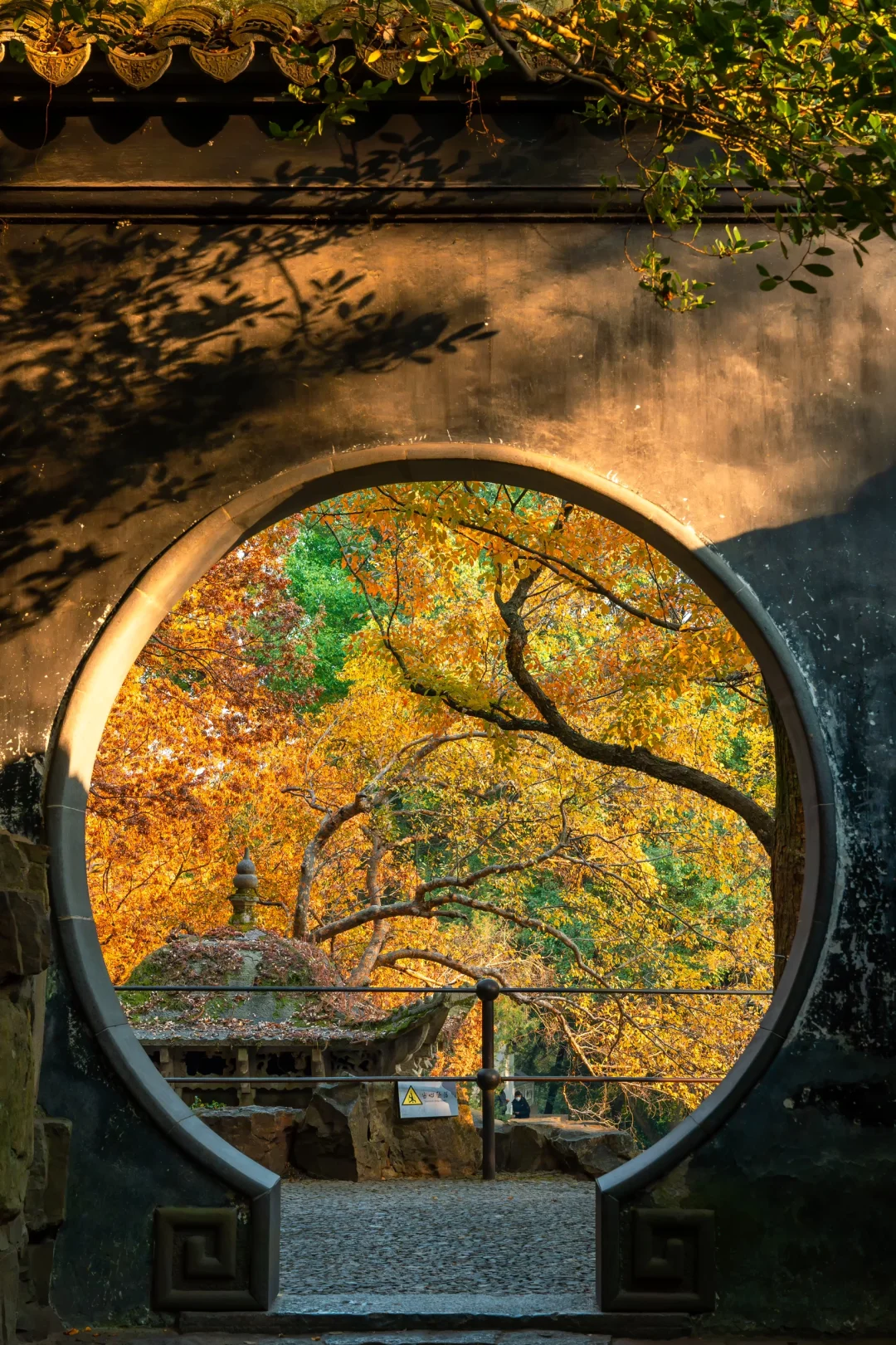 园虽小却层次丰富、一步一景圆形拱门搭配红枫秋色堪称一绝