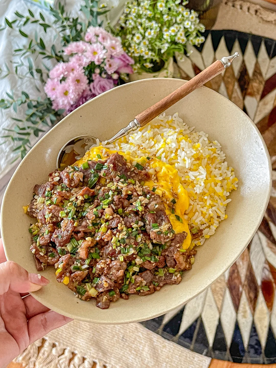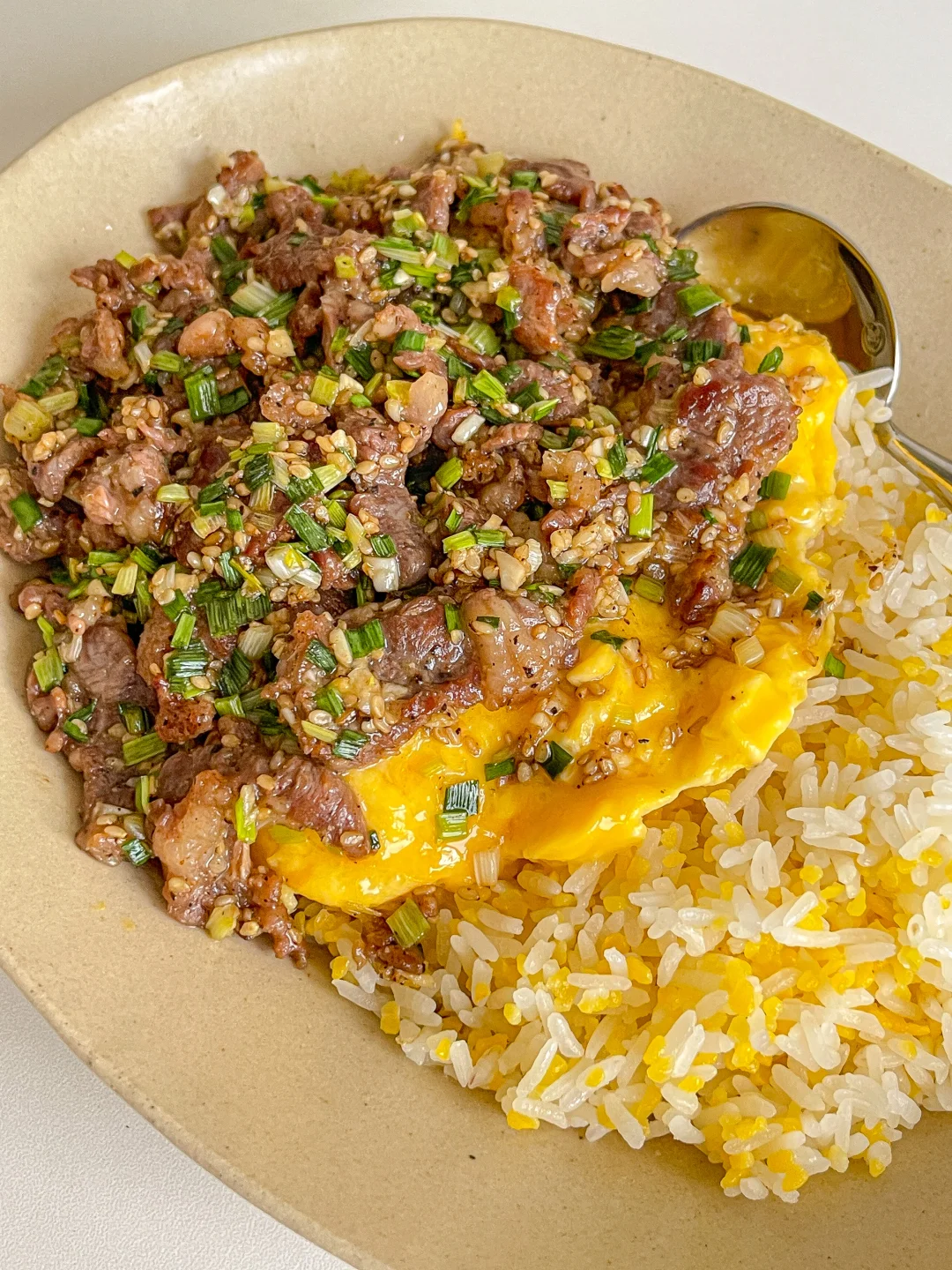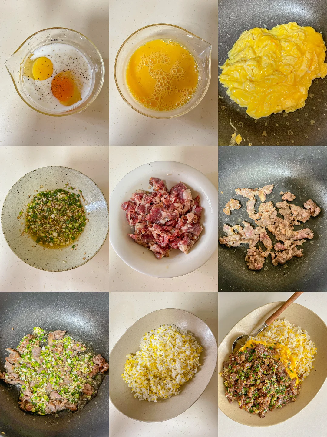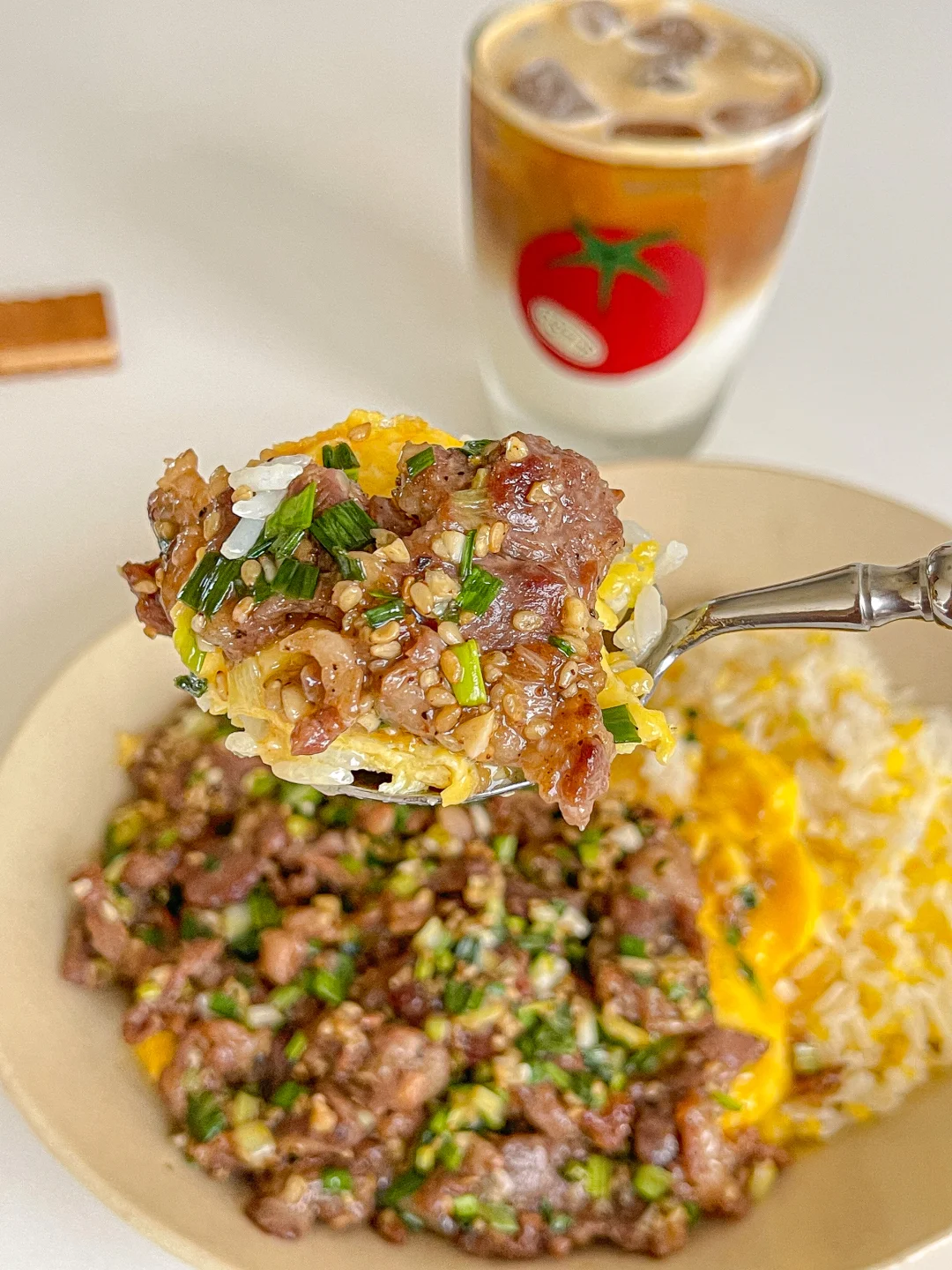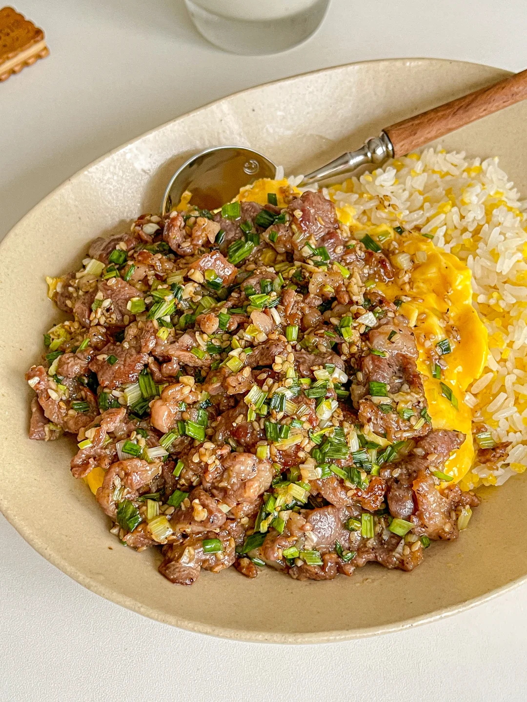 吃不腻的 盐葱牛肉饭 ‼️ 葱香四溢 牛肉嫩滑 配米饭一绝 食材:🍳 牛肉➕鸡蛋➕葱 盐葱酱:🧂 大量葱花➕1勺蒜蓉➕2勺白芝麻➕1勺芝麻油➕1勺橄榄油➕少量黑椒海盐(搅拌均匀备用) 做法:🥣 1.两个鸡蛋➕黑椒海盐少量牛奶 搅拌均匀 小火滑熟 2.牛肉片炒至7分熟 倒入盐葱酱 大火激发出香味 盛出即可 自律餐也可以好吃到光盘💯低卡高蛋白的搭配 这一口下去香喷喷的巨满足 [亲一个R]