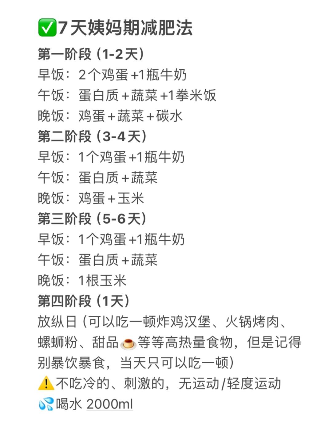 第[一R]阶段(1-2天) 早饭:2个鸡蛋+1瓶牛奶 午饭:蛋白质+蔬菜+1拳米饭 晚饭:鸡蛋+蔬菜+碳水 第[二R]阶段(3-4天) 早饭:1个鸡蛋+1瓶牛奶 午饭:蛋白质+蔬菜 晚饭:鸡蛋+玉米 第[三R]阶段(5-6天) 早饭:1个鸡蛋+1瓶牛奶 午饭:蛋白质+蔬菜 晚饭:1根玉米 第[四R]阶段(1天) 放纵日(可以吃一顿炸鸡汉堡、火锅烤肉、螺蛳粉、甜品🍮等等高热量食物,但是记得别暴饮暴食,当天只可以吃一顿) ⚠️不吃冷的、刺激的,无运动 💦喝水 2000ml
