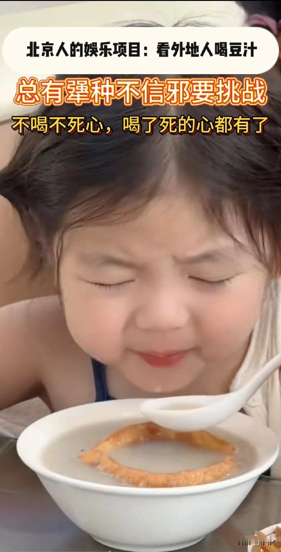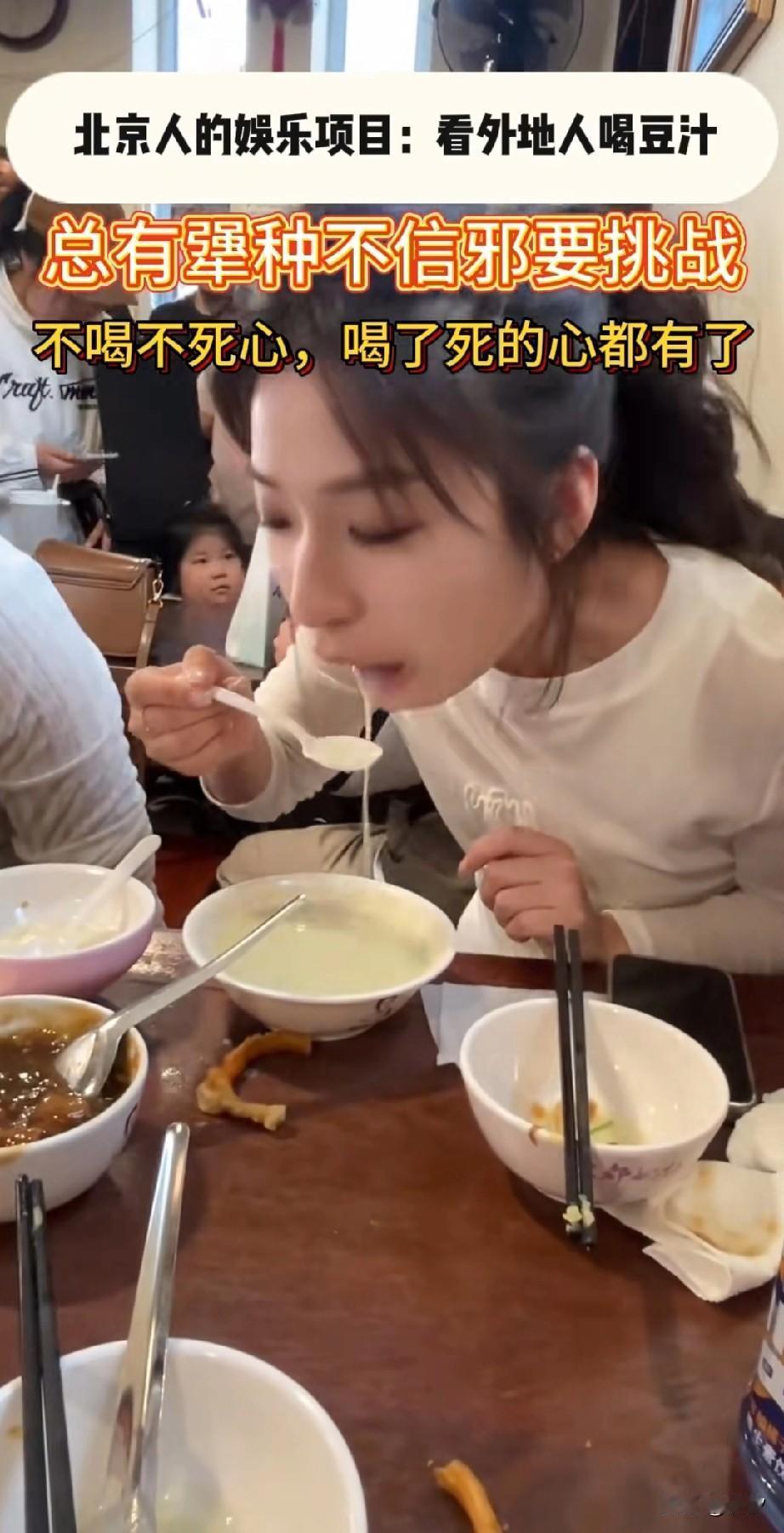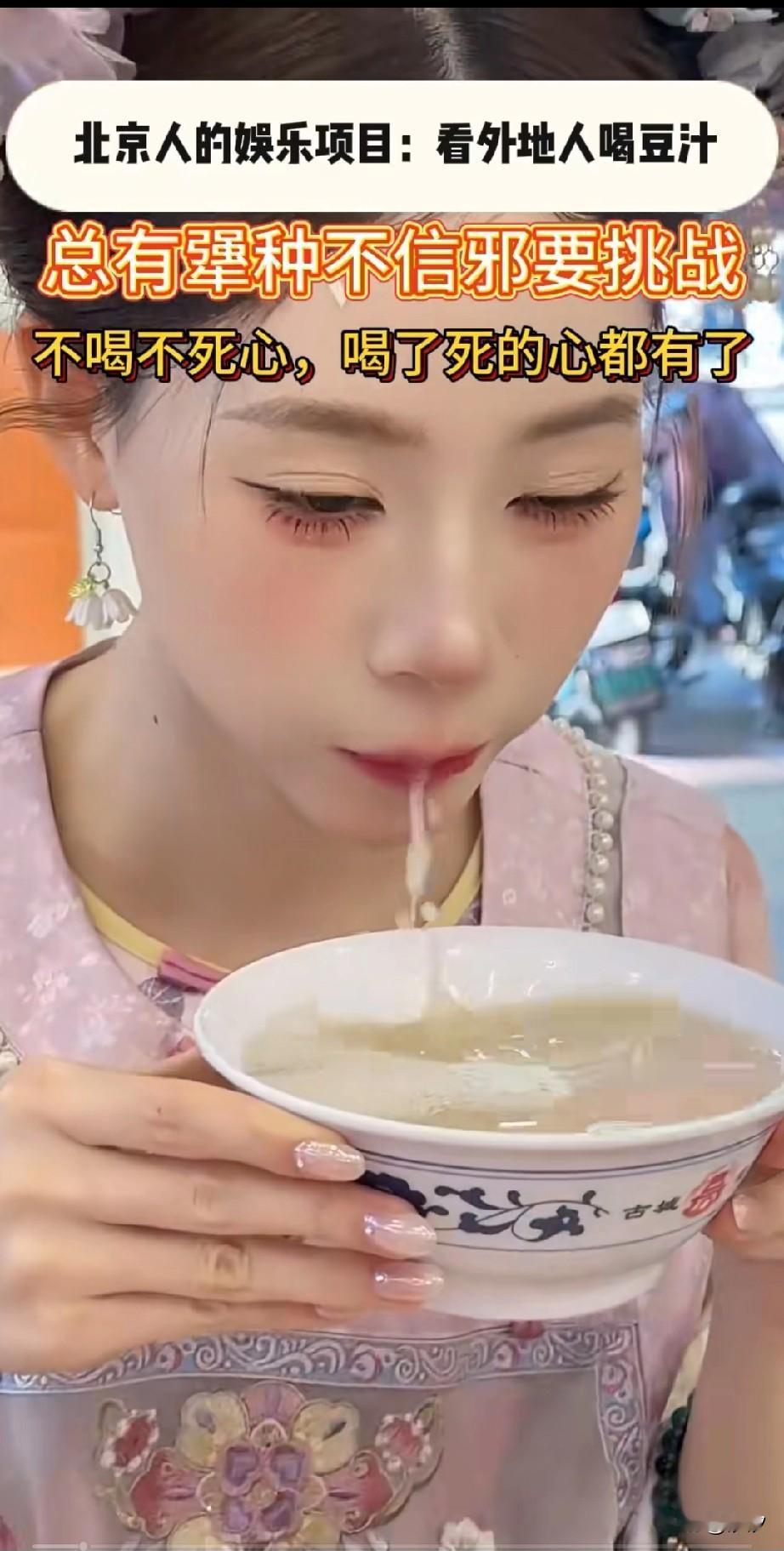 北京人的娱乐新项目有了, 就是看外地人来北京喝豆汁, 北京的豆汁可是大名鼎鼎, 总有犟种要来挑战, 结果都是一个一个不吱声, 小姐姐穿着精致的古装来北京旅游, 本着来都来了怎么能不尝尝北京的豆汁呢,看着和其他地区的豆浆差不多, 她直接灌了一大口, 结果表情立马不受控制, 直接吐了出来, 喝了多少就原封不动的吐到了碗里, 旁边的可爱的小宝宝也是, 喝了一大口觉得没问题, 结果下一秒表情变成了苦瓜脸, 然后就吐出来了, 其他的小姐姐不服气, 于是也开始挑战了, 可爱的美女也是喝了一口, 然后表情凝固, 嘴巴不受控制的吐出了白汁, 旁边的两位男士笑的合不拢嘴, 最后一美美女应该是和家人一起用餐, 吃了好多美食, 喝了一口豆汁差点没把刚才吃的饭吐了出来,旁边的家人也是哈哈大笑, 还真是不喝不死心, 喝了死的心都有了! 大家对于北京的挑战项目喝豆汁怎么看? 请用一个词形容北京豆汁儿的味道?北京豆汁真的很难喝吗? 豆汁品鉴 北京小豆汁 小豆汁 北京豆汁店 豆汁文化 泡豆汁儿 豆汁儿咖啡