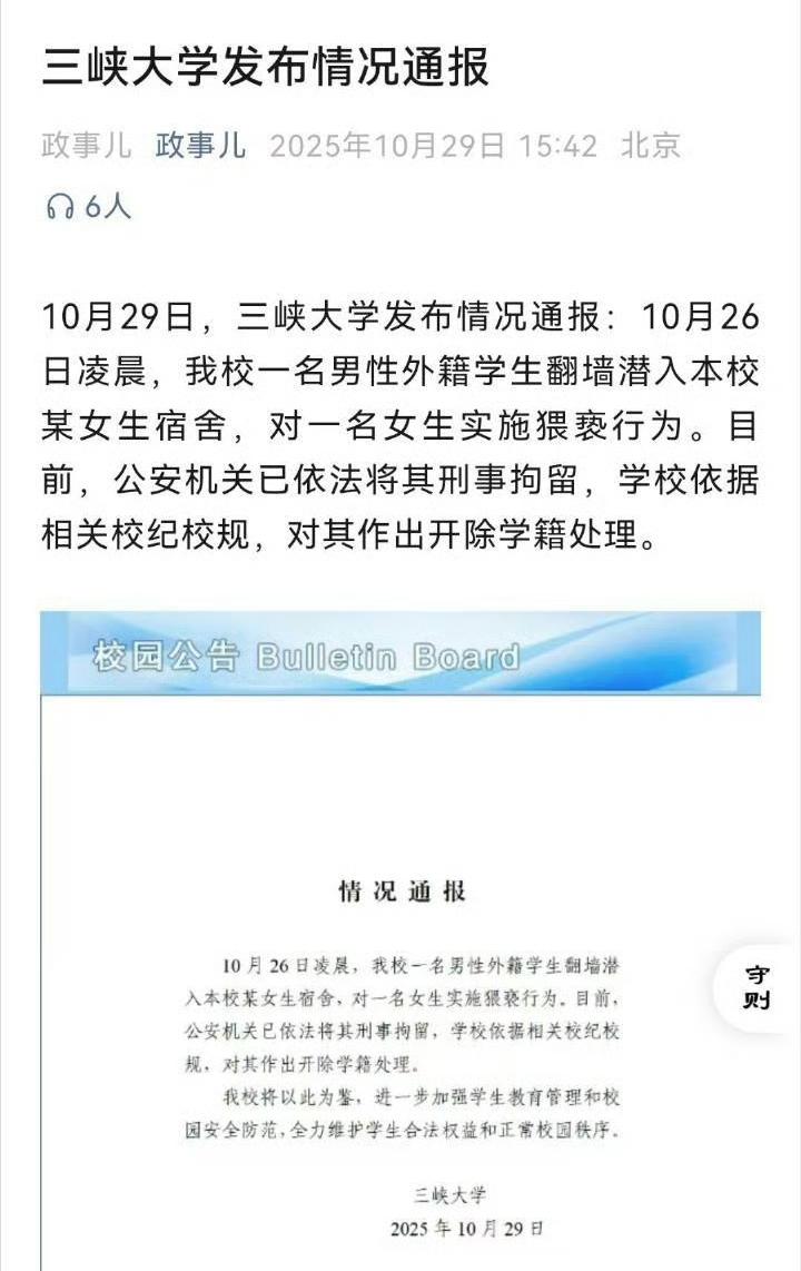 三峡大学通报留学生夜闯女寝。 招留学生的标准能不能提高一点,不要是个人就要,还有留学生宿舍也可以不用那么好哈,自己国家的学生没有的待遇都给留学生。 从我的角度来讲,我并不能理解某些非985,211学校,甚至是职业学校也招一大批留学生来的干嘛的,难道你们也追求国际化? 还是说你们真能从这些留学生身上赚到钱?目前反正我是还没有看到过哪个学校公布过自己每年留学生项目的盈利是多少。 而且这些学校他也不是不知道一旦留学生出事舆论会是什么情况,你看三峡大学的评论区关的多快?它们是知道自己会被冲的。 看了一下三峡大学6月份的毕业典礼,留学生还是挺多了!拿着奖学金,在校园干着违法的事,这种留学生一定要严惩!