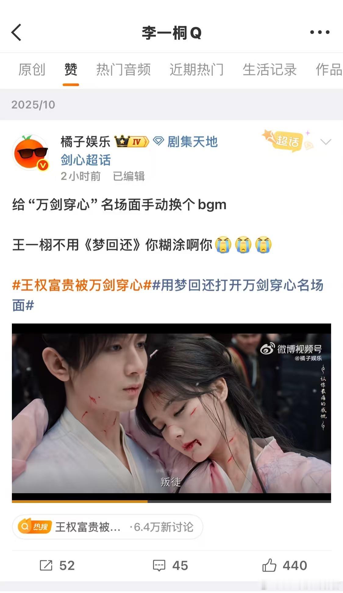 李一桐点赞 细节控狂喜!李一桐亲自认证二创的精准卡点,每个转场都在致敬“相视一笑轻王权”的经典。这波双向奔赴,比原剧的刀还让人心动!