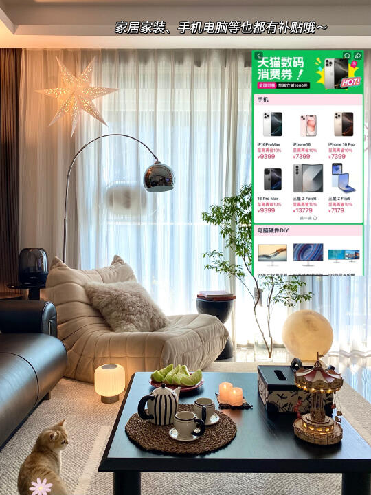 hi大家好我是咩咩,欢迎来到我的100平小家 我家是偏温馨的现代简约风格 当初装修也是全程自己摸索着来,把喜欢的东西一点点搬回家 慢慢布置成现在温馨舒适的模样 软装都以黑白粽三色为主,黑色的沙发和黑色的圆桌真的很高级!简约又出效果 . 其实装修的时候很多家电软装也都选择了网购,真的可以省下不少钱呢! 如果赶上活动就会更省钱了,像近期的淘宝国补就真的很划算 购物前🍑🔍【国补】真的太香了 比如我家的海er386白洗烘套装 银色搭配白色的外观高级耐看 变频柔烘,烘干效果很不错,南方梅雨季节也不怕衣服潮湿啦 还自带高效精华洗,在家也能护理娇嫩衣物 这套原价一万多的洗烘套装,国补后8K出头就能到手了,真的太香了 . 还有我家的老板双子星E1顶吸油烟机 顶吸大吸力,非常适合喜欢爆炒的中国家庭 0手动,全程自动控烟 双腔静吸,不仅静音也不串味 这套原价6千多的油烟机,国补后3K出头就能买到了 这个价格真的很划算了 . 而且现在上🍑🔍【国补】进入主会场,就可以选择所在的城市领取相应的补贴资格了 国补折扣:在到手价基础上一级能效/水效补贴补贴20%,二级能效/水效补贴15%✨ 🔖国补可叠加多重优惠:以旧换新、88vip消费券、百亿补贴、分期免息等,叠加后至高补贴40%! 🍑国补也在陆续开新城~目前河南、偏远地区(新疆西藏)也支持国补咯! . 而且不仅是家装家居有补贴,电脑手机ipad也有哦!在装修或者想要更换电子设备的宝子们千万别错过咯~ . 可以把家装成自己喜欢的样子真的是一件很幸福的事情 每天下班以后和猫猫🐈一起宅在家里,我想这就是我想要的生活吧~
