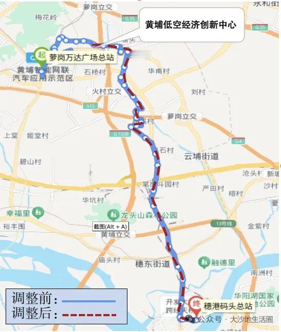 由黄埔开发区西区开往萝岗万达广场的的公共汽车575路调整示意图如下图,原“穗港码头总站⇆萝岗万达广场总站“调整为“穗港码头总双向←→黄埔低空经济创新中心”,总里程有所缩短,取消抵消站点。