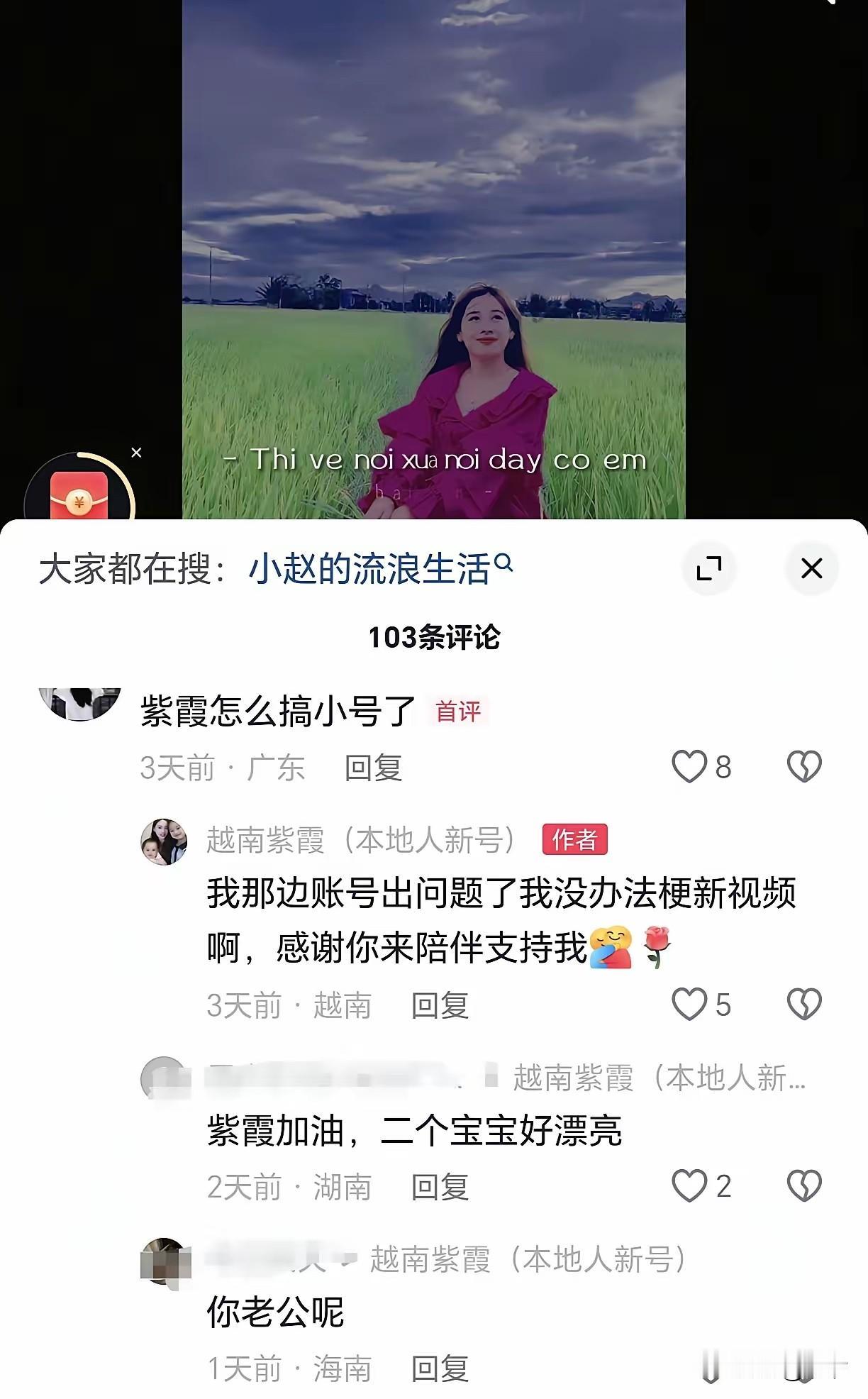 越南紫霞因为长相和大话西游的紫霞仙子相象在中国火了, 她的老公是湖南小伙小赵, 两人幸福的生活在一起, 后来因为文化观念差异两人家庭矛盾不断,女方指责男方背叛感情, 对自己太过冷淡, 两个月都没有碰自己, 还睡在客厅打冷战, 男方指责紫霞把家里的钱转移到越南, 完全不承担家庭生活开支, 就这样两人最终离婚, 紫霞带着两个孩子回到了越南, 但是她还不忘在国内互联网活跃, 还想着直播带货赚快钱, 不知怎么的她的账号接连被清理, 她的问她怎么回事, 她只是回复账号不知什么原因接二连三被清空作品, 有网友表示没有正能量还是不要拍了, 也有网友表示既然都回越南了就不要继续赚国内网友的钱了! 大家对于越南紫霞仙子这事怎么看? 跨国恋幸福吗? 一起聊聊跨国恋 越南紫霞夫妻 紫霞仙侣 至尊紫霞仙子