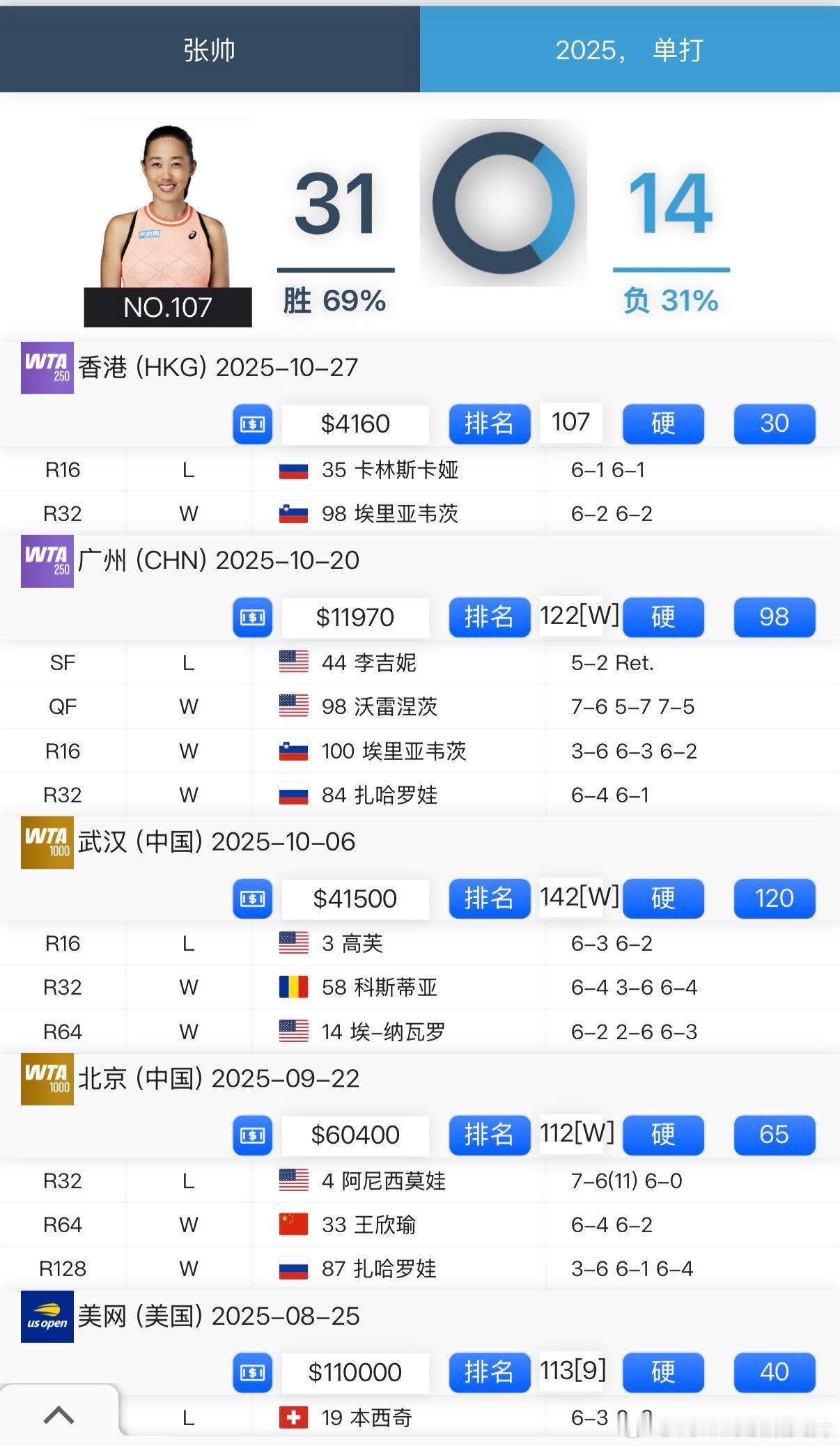 R2❌🇨🇳张帅1-6/1-6🇷🇺卡林斯卡娅
