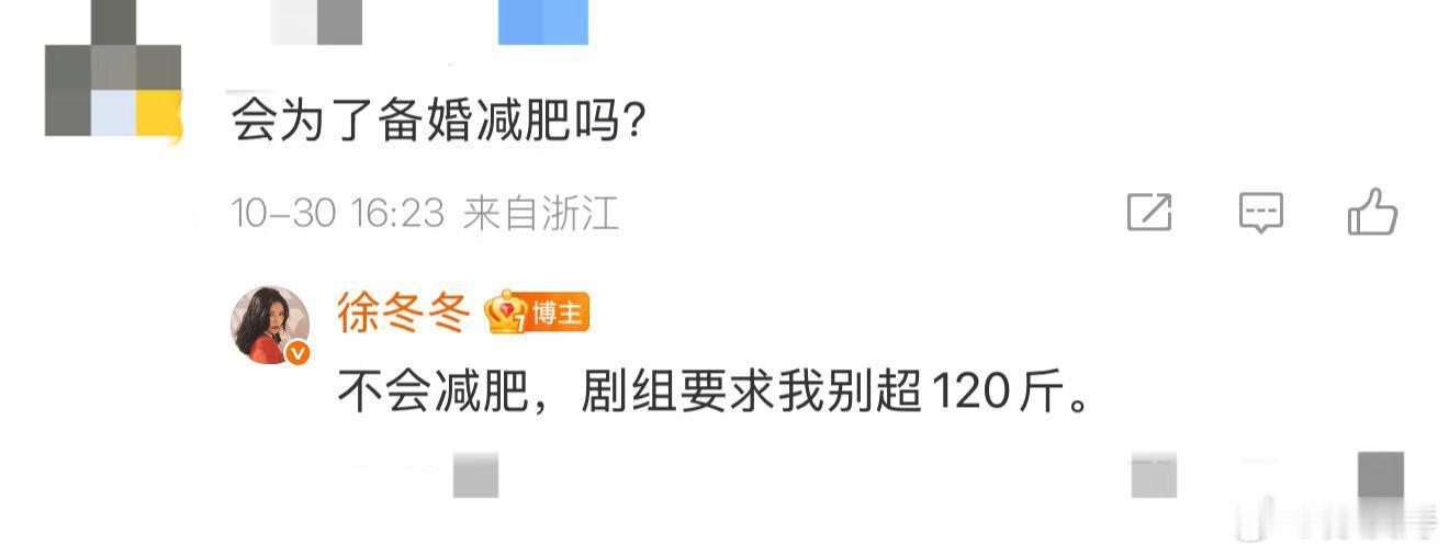 徐冬冬的感情一波三折,今天分享了双人视频,两个人紧贴拍大片,又恢复到了往日的甜蜜中。尽管婚礼在即,徐冬冬仍然保持着自己120斤的身材,身穿紧身衣的她腰部赘肉明显,评论区回应网友问她会不会为了备婚减肥,“不会减肥,剧组要求我别超120斤。”