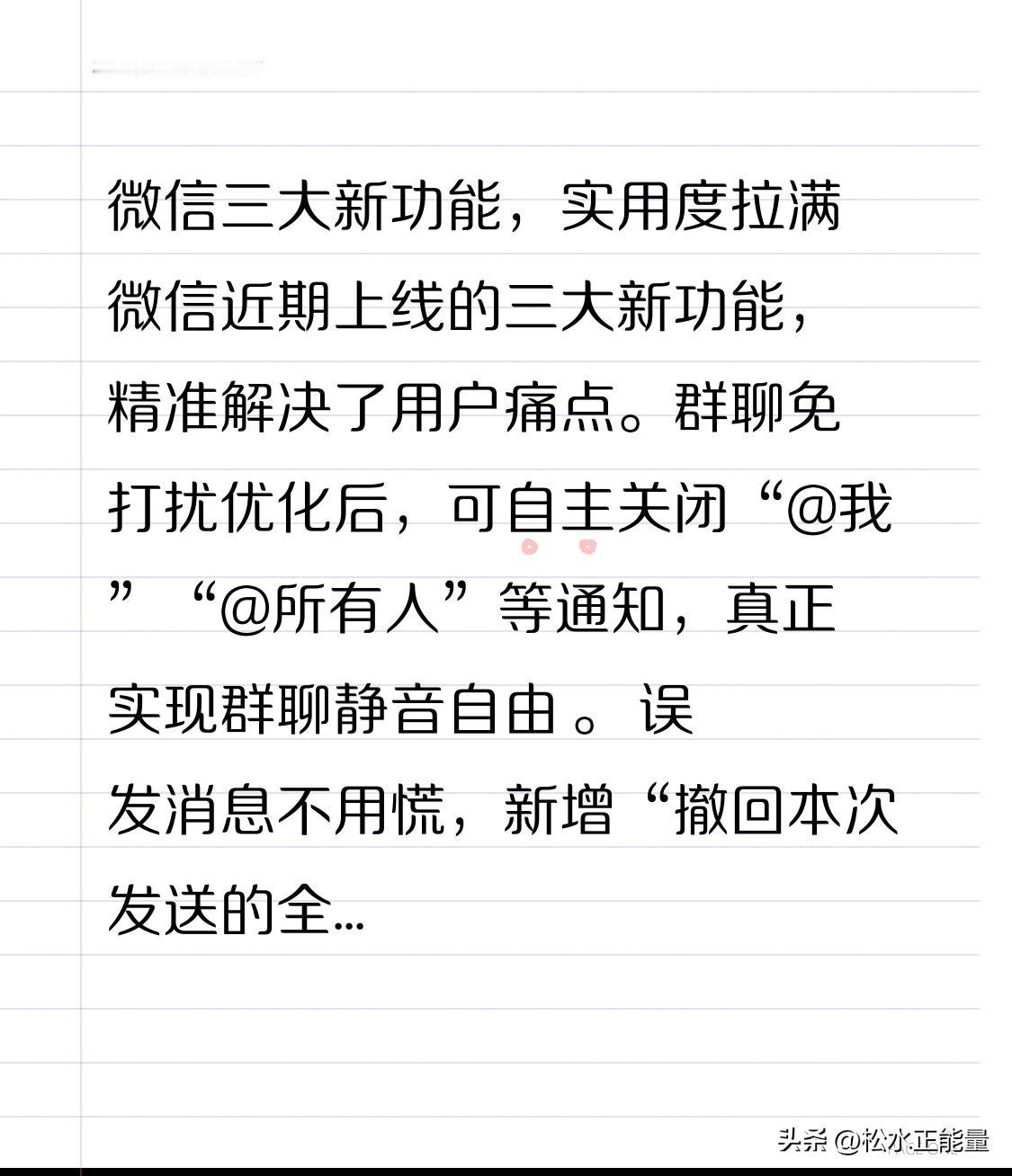 微信三大新功能,实用度拉满 微信近期上线的三大新功能,精准解决了用户痛点。群聊免打扰优化后,可自主关闭“@我”“@所有人”等通知,真正实现群聊静音自由 。 误发消息不用慌,新增“撤回本次发送的全部消息”选项,2分钟内可一键撤回多条内容,告别逐条操作的狼狈。 安卓端同步上线“聊天记录管理”,支持扫码导出至新机或电脑,换设备、清内存再也不怕丢失重要记录。这些更新让沟通更高效省心。