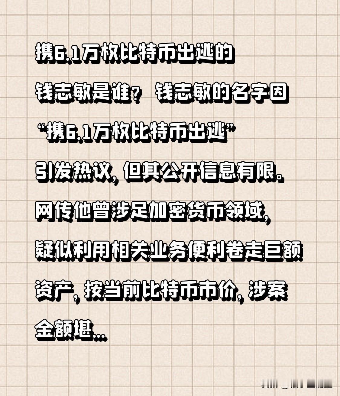 携6.1万枚比特币出逃的钱志敏是谁? 钱志敏的名字因“携6.1万枚比特币出逃”引发热议,但其公开信息有限。网传他曾涉足加密货币领域,疑似利用相关业务便利卷走巨额资产,按当前比特币市价,涉案金额堪称天文数字。 目前其出逃去向不明,相关追查仍在推进。加密货币的匿名性、跨境流通性让案件侦破难度不小,这也给投资者敲响警钟。你是否关注后续追查进展?欢迎留言讨论。