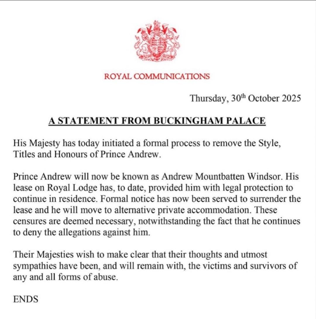 查尔斯三世弟弟安德鲁王子被剥夺王室头衔! 白金汉宫声明:安德鲁王子被剥夺了所有的王室头衔,沦为平民并被赶出王宫。