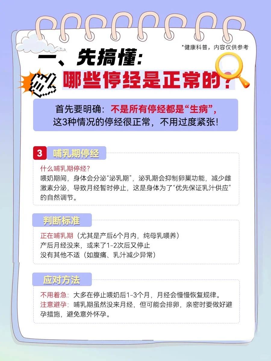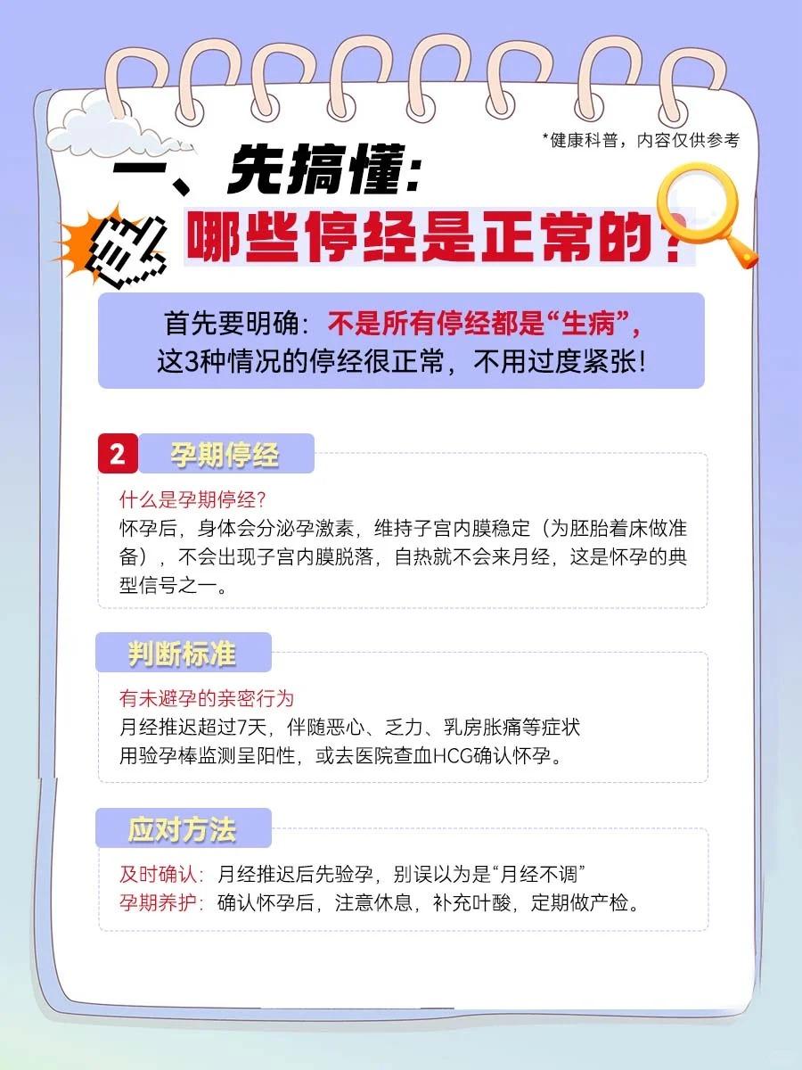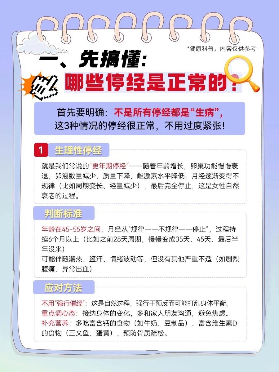 【关于“停经”,正常VS异常,看完不慌了!】 月经突然停了,是不是身体出问题了? 45岁就没来月经,算早停经吗? - 提到停经,很多姐妹会紧张,但其实停经分“正常”和“异常”,不是所有停经都需要担心。 今天把停经的“来龙去脉”讲透,从区分类型到应对方法,超详细。