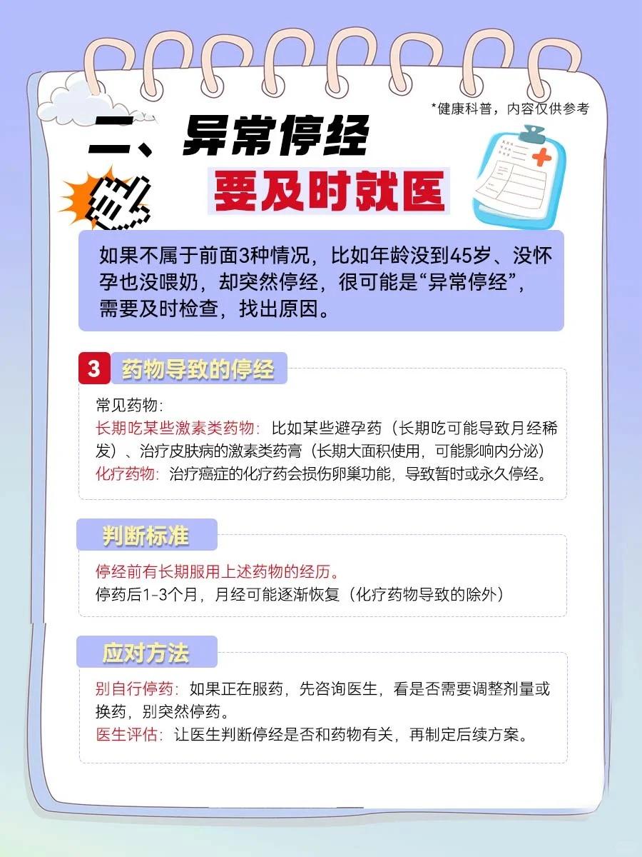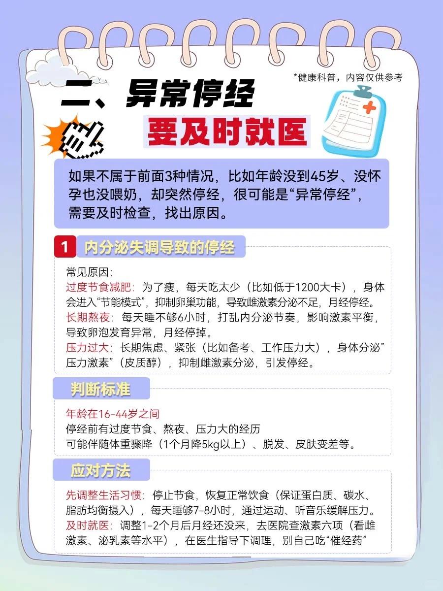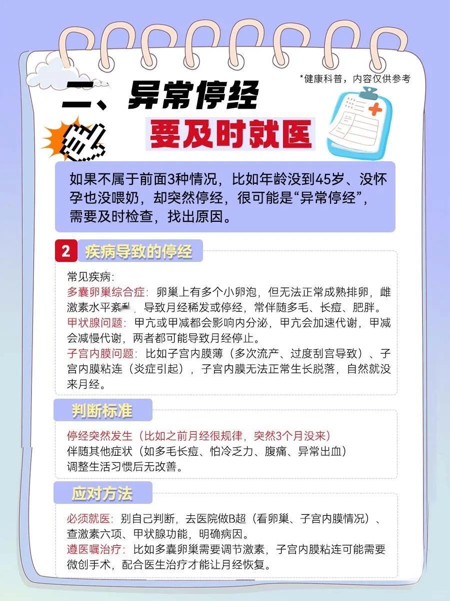 【关于“停经”,正常VS异常,看完不慌了!】 月经突然停了,是不是身体出问题了? 45岁就没来月经,算早停经吗? - 提到停经,很多姐妹会紧张,但其实停经分“正常”和“异常”,不是所有停经都需要担心。 今天把停经的“来龙去脉”讲透,从区分类型到应对方法,超详细。