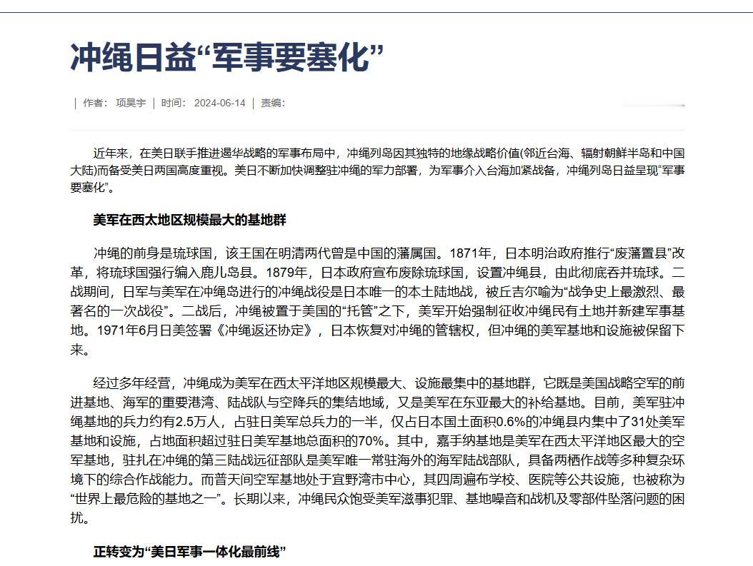 我一直以为咱们解放军的铁拳会首先打台湾省,但最近越来越觉得我们海军的第一个铁拳方向原来是冲绳。 原来,毛主席早年就给咱们指了条路子,收复台湾得先拿下冲绳。 这岛明清时候是咱们的藩属国琉球,后来被日本强吞,二战后又被美国攥在手里当“军事据点”,现在直接成了日美钉在东亚的一根钢钉子,死死卡着台海的脖子。 要知道,美军在冲绳足足部署了2.5万兵力,占了驻日美军总兵力的一半。 更夸张的是,冲绳面积只占日本国土的0.6%,却挤着31处美军基地,占了驻日美军基地总面积的70%,等于把大半个驻日美军的“家当”都堆在了这巴掌大的地方。 这里面的嘉手纳基地,是美军西太平洋最大的空军基地,F-22、F-35这些先进战机想来就来,RC-135电子侦察机天天在台海周边“晃悠”,跟在咱们家门口装了个24小时不歇的空中警戒哨似的;还有第三陆战远征部队,这是美军唯一常驻海外的海军陆战队,手里握着两栖作战的各种重家伙,明眼人都看出来,就是专门盯着东亚海域的。 日本也没闲着,把冲绳当成了盯紧台海的“前哨站”。 在离台湾才110公里的与那国岛上,日本直接建了雷达站,还派了电子作战部队,台海这边哪怕有个风吹草动,那边立马就能察觉;宫古岛和石垣岛也没空着,部署了岸舰导弹部队,这些导弹的射程能全覆盖周边海域,等于在台海的门户上装了把“电子锁”,就等着碍事。 更狠的是,日本要把驻冲绳的第15旅团升格为师团,兵力从2500人扩到7000人——师团可是有独立作战能力的,这明摆着是为干预台海“囤兵”,算盘打得噼啪响。 不光各自加码,美日还在冲绳拧成一股绳搞军事一体化。 美军计划2025年底前在冲绳组建濒海作战团,这支部队轻装灵活,能快速抢占岛屿、封锁水道,说白了就是专门盯着台海方向;他们还琢磨着“台湾有事”时,把“海马斯”火箭炮这些导弹部队部署到冲绳的离岛,建临时基地,日本自卫队则负责送弹药、送燃料,这两家一唱一和,直接把冲绳打造成了干预台海的“桥头堡”。 去年更离谱,美日还计划制订首份“应对台海紧急事态”的联合作战计划,连导弹部署的细节都写进去了,这哪是“防卫”,分明是等着趁火打劫,把冲绳彻底绑上战车。 再往台海局势上扣,就更明白冲绳的“卡脖子”作用了——要是不先敲掉冲绳这个据点,咱们的舰队出第一岛链时,嘉手纳的战机就跟在后面“盯梢”,后勤补给线会被宫古岛的导弹威胁,美军的濒海作战团还能从侧面包抄,到时候咱们的行动会处处受制,等于腹背受敌。 毛主席当年肯定算透了这层:收复台湾先拿冲绳,不是绕远路,是打蛇打七寸——先掰掉对方架在咱们脖子上的手,不然就算解决了台湾问题,身边留着这么个装满美军的“火药桶”,根本不得安宁,后续的安全隐患只会更大。 再看眼下的趋势,冲绳的军事要塞化越来越露骨。 美军在这儿更新战机、重组部队,日本在离岛修工事、增兵力,俩家恨不得把所有先进武器都堆到冲绳来。 说到底,冲绳就像东亚海域的十字路口,谁控制了冲绳,谁就掌握了台海、东海的主动权——这也是为啥说解放军的铁拳先指向冲绳,是真的看透了其中的关键。 值得提的是,冲绳民众早就对这种“火药桶”处境怕得不行——二战时,当地10万平民死在战火里,现在又被美日当成“棋子”,可日美根本不管这些,一门心思把这儿打造成战争前沿。 只不过他们算盘打得再精,也得看看咱们解放军答不答应——真要动起手来,这根“钉子”该拔还是得拔。