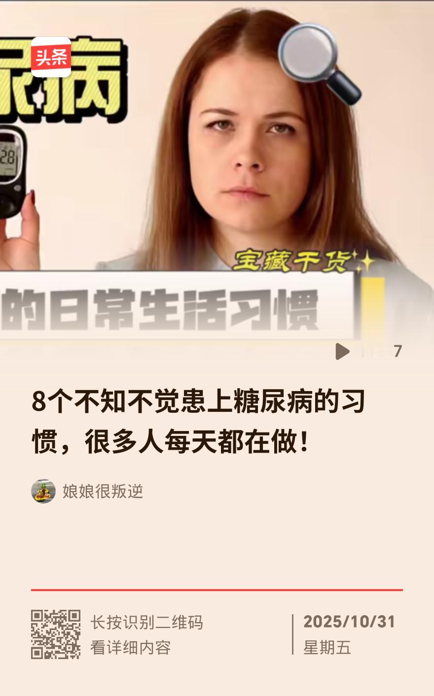别再这么做了!这8个习惯悄悄喂出糖尿病,很多人天天犯 你以为只有吃糖多才会得糖尿病?错了!我国成年人糖尿病患病率还在涨,这8个日常习惯才是“隐形杀手”,快看看你中了几个! 晚饭别瞎拖,7点后吃就是给血糖“挖坑”!《糖尿病护理》研究早说了,晚吃晚餐胰岛素降6.7%,葡萄糖反升8.3%,睡前4小时别碰吃的才靠谱。红肉也别狂炫,每周超2份,糖尿病风险蹭蹭涨,换成鱼虾不香吗? 甜饮料就是“糖水炸弹”,每天2杯以上含糖的,风险直接飙41%,代糖的也逃不掉,运动都救不了!啤酒更是“升糖王者”,麦芽糖吸收快,血糖比喝白糖水还疯,白酒能量抵蛋糕,千万别贪杯。 睡觉开夜灯、每天睡不够6小时?胰岛素都要“罢工”,血糖指定乱。上班族别久坐,每天坐超6小时,糖尿病风险高26.7%,每小时起来动10分钟能救命。懒得运动更不行,越不动越胖,糖尿病就爱找胖子! 这些习惯看着小,积累起来超伤身,赶紧自查整改,别等真得病才后悔!糖尿病饮食 糖尿病控糖误区 糖尿病控糖