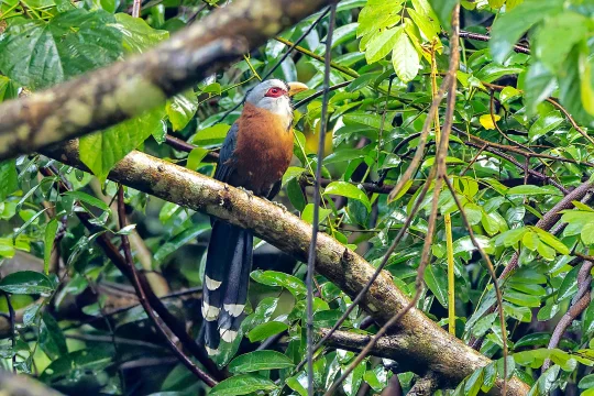 这只漂亮的地鹃是我们当天观鸟早上看到的第1只目标鸟种,非常惊喜,但是当时突然降雨,它又一直穿行着雨林里遮挡严重,动作又快,距离又远,只能拍到这张姑且能记录。整个树都是湿润润的,让整张图都有一种水灵灵的感觉。