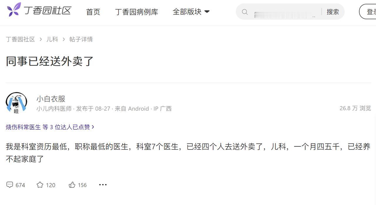 太魔幻了,一个科室7个医生,4个下班都在送外卖,这不是电视剧,而是正在发生的魔幻现实。 就在最近,医学论坛“丁香园”上有个很热门的帖子,有个儿科医生发帖说,一个月收入四五千,养不起家庭,同事都跑去送外卖了。 现在的情况是,很多医院都在减绩效降工资,有数据显示,2024年有57%的医生降薪,其中1/4的医生降薪幅度都在10-29%。 原来六千的工资变四千,五千变三千,一边是收入暴跌,一边又是家里面要生活开支,爸妈要养老,孩子嗷嗷待哺,这就导致很多医生做起了副业。 这个时候,送外卖就成了一份很好的兼职工作,时间灵活,而且收入还不低,有人兼职跑外卖一个月也能有6000多元的收入,差点也有四五千,比很多正经工作都强了。 从美团公布的数据来看,今年6月份,全国众包高频骑手的平均月收入已达9793元,就算除去一二线城市那些高收入骑手,在小县城送外卖一个月也能有五六千的收入。 而且就在27号,美团还宣布给全国所有骑手交社保,不光全职,就算是众包骑手也能享受到社保保障,真正给所有骑手实现了兜底,让外卖骑手一跃超过很多其他蓝领和灵活职业。 骑手社保和收入的上涨,让大家对某些职业正在祛魅,对外卖骑手的看法也在改变,越来越多人意识到,职业不分贵贱,只要能赚钱养家糊口的工作,就是真正的好工作!