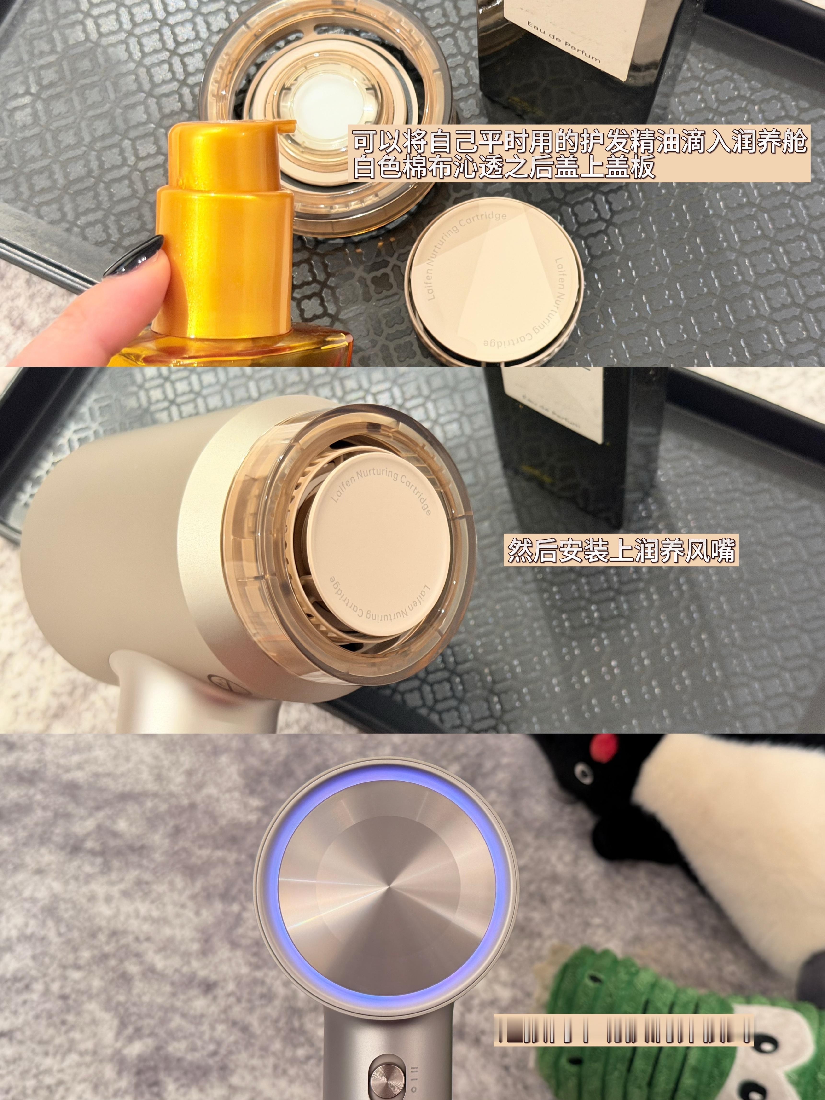 最惊喜的这款有润养模式,头发吹到八成干,就把平时用的护发精油滴进润养舱,安装上风嘴,就能边吹边护发!!感觉这样精油能被均匀的渗透发丝,也不用徒手抹了(以前抹完手上全是油🙈...好爱这个设计哈哈