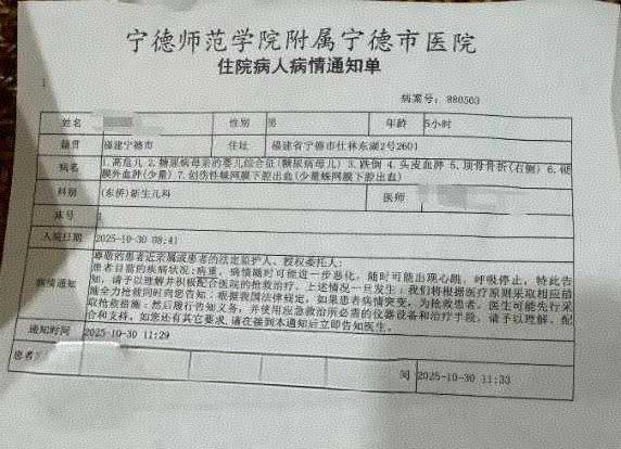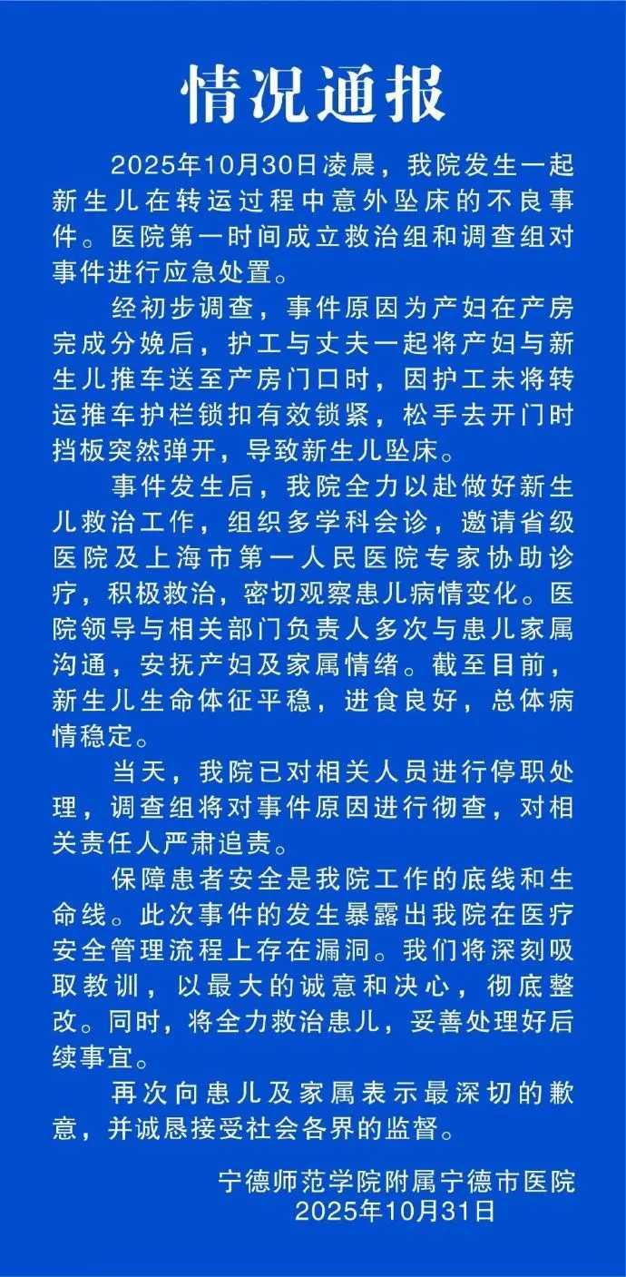 “刚来到世界的孩子,还没好好看看家,就先摔在了地上。”10月30日清晨,福建宁德师范学院附属宁德医院发生的一幕,让新手父亲林先生痛彻心扉。刚出生仅2小时的新生儿,在产房转往病房的途中从推车坠落,被诊断为颅骨骨折并收到病重通知单,而涉事人员竟是医院第三方派遣的护工。 这场悲剧发生在凌晨5点多。林先生的妻子凌晨3点多顺利分娩,在产房观察两小时后,母子二人一同躺在转运推车上,由护工送往病房。可走到产房门口时,护工松开推车护栏去开门,护栏突然打开,襁褓中的新生儿瞬间摔落在地。 “孩子掉下来后,只有一个护士过来看了看,说先回病房观察。”林先生回忆,直到上午7点多,发现孩子不肯喝奶,他反复要求检查才得到重视。诊断报告显示,新生儿右顶骨骨折、右顶部头皮血肿,还伴有右顶部少量硬膜外血肿与蛛网膜下腔出血,院方当场下达了病重通知单。更让他震惊的是,直到当天下午第三方公司人员前来慰问,他才得知涉事护工并非医院正式员工,而是福建朗洁物业管理有限公司派遣人员。 10月31日,涉事医院发布情况通报,确认转运时护栏未锁紧导致意外发生,已对相关人员予以停职处理,承诺将彻查追责。医院院办工作人员透露,不仅医院成立了工作组,市级卫健系统也已组建专门团队介入调查。目前新生儿生命体征平稳,进食良好,但后续恢复情况仍需持续观察。 这起事件引发公众对医院护理管理的强烈关注。网友纷纷质疑:“新生儿转运这么关键的环节,为何交给第三方护工?护栏检查等基础操作为何没做到位?”截至发稿,第三方派遣公司尚未公开回应,事件具体责任划分仍待调查结果。