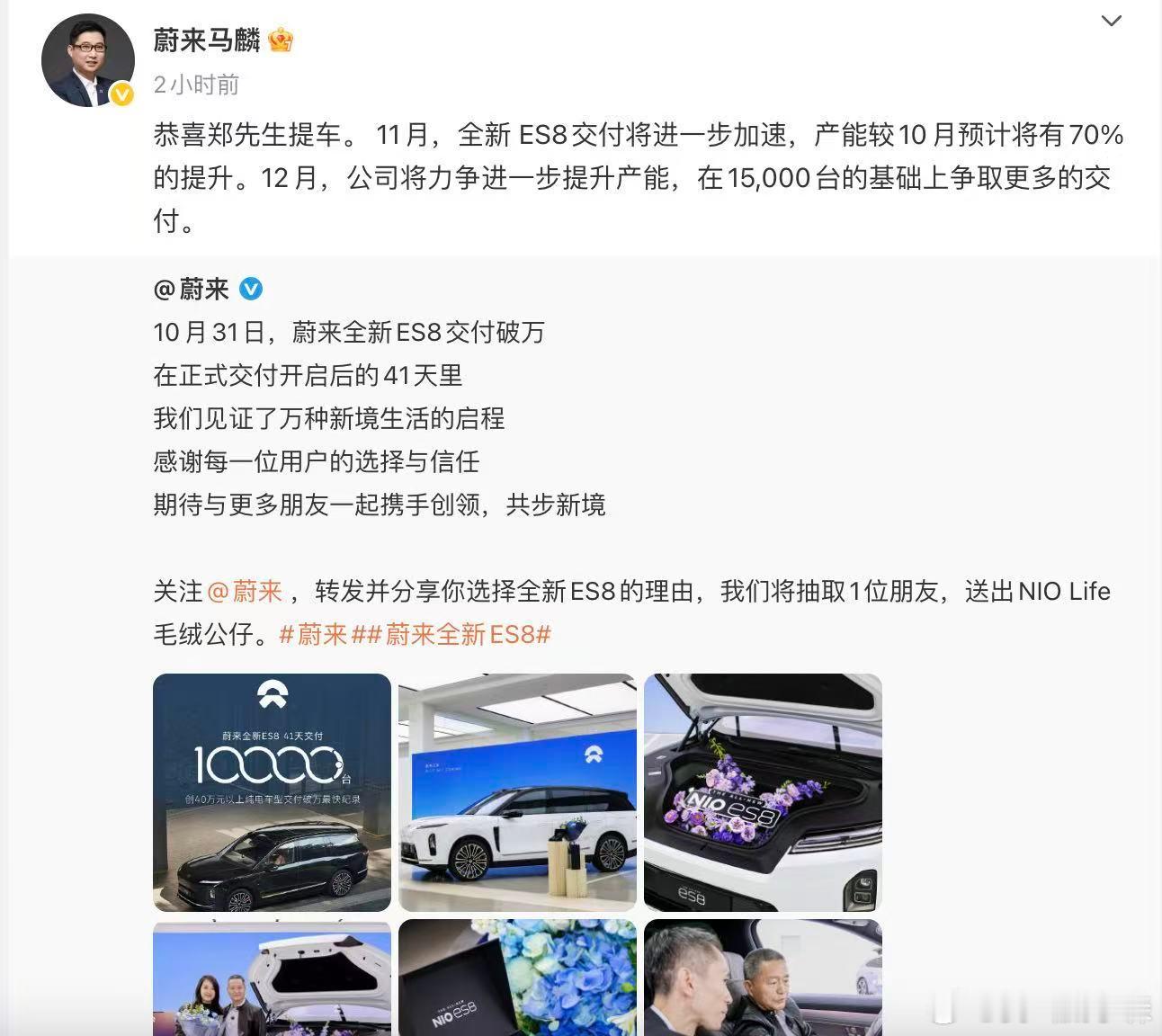 好消息,蔚来ES8的产能将有所提升,各位老板的ES8,看来将在不久的周六,显示的提车时间会有所提前