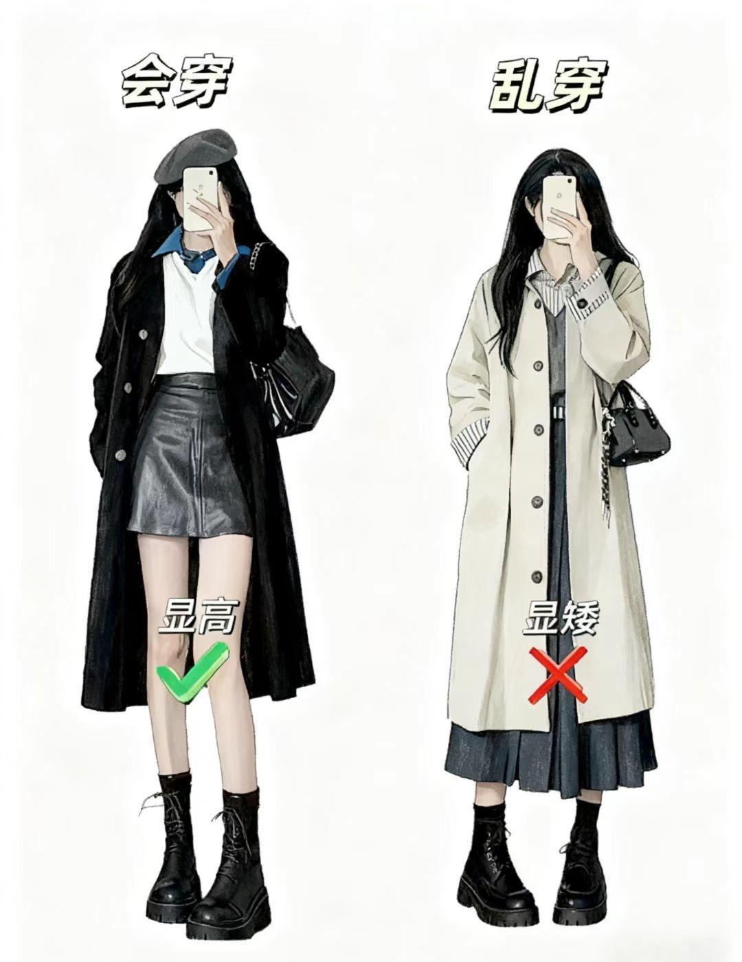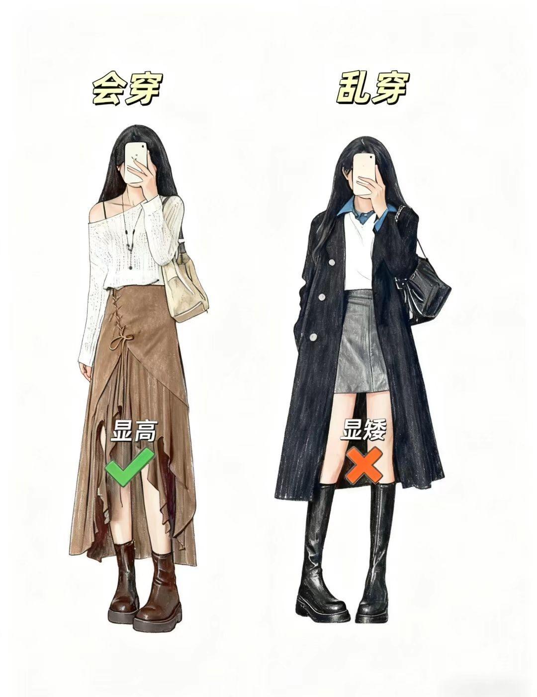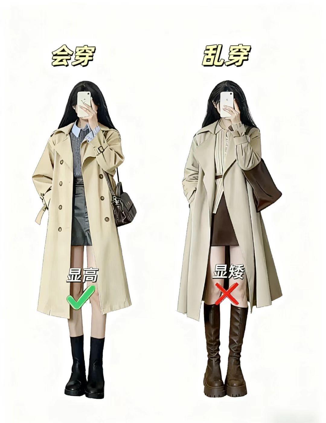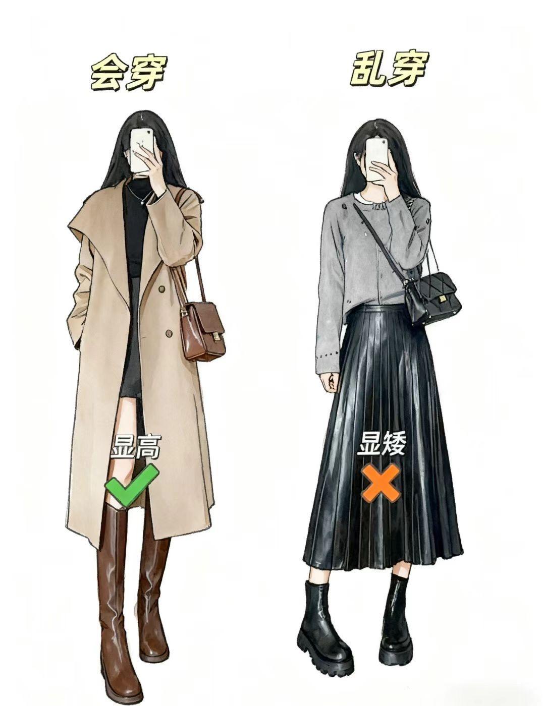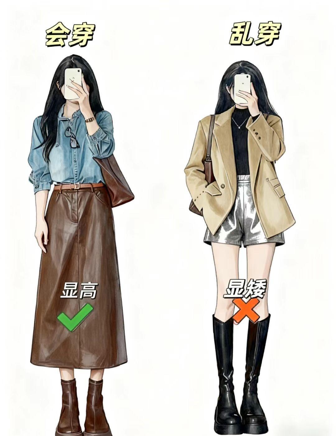 上短下长,腿才长。 不是你矮,是穿错了。 短毛衣配高腰裤,腰线往上提一提,腿立刻多出十厘米。 同色系从头穿到脚,不是懒,是聪明。 颜色连成一线,眼神自然跟着往下溜,溜着溜着就以为你腿到地了。 别穿五五分,像被腰斩。 别叠三层,像 stuffed dumpling。 过膝靴别乱踩,小腿粗的别穿桶状的,像套了麻袋。 今年流行拖地阔腿裤——裤脚盖住鞋面,腿直接从胯开始长,不露脚踝,反而更显高。 连体裤回潮不是巧合,是设计界帮你把比例锁死了。 职场一套短西装+直筒裤,脚上踩双裸色尖头靴,站起来像被拉了个伸展操。 头发别蓬,高马尾一扎,头顶多一寸,整体高两寸。 你不是矮,只是没找对节奏。 穿对了,风都替你拉腿。