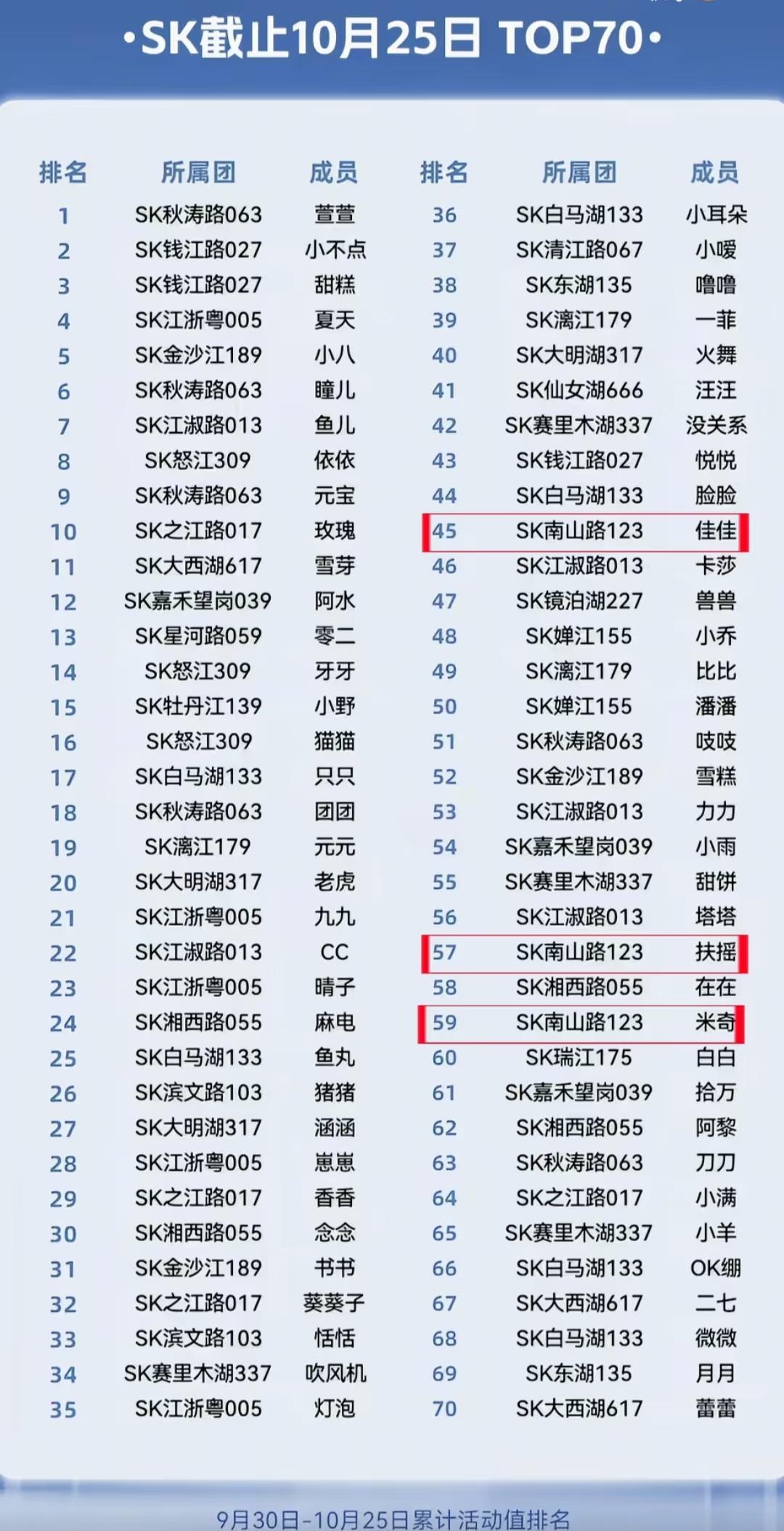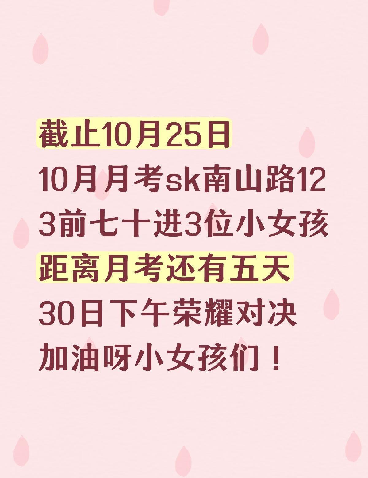 sk10月月考数据终于更新啦!! 截止10月25日sk南山路123月考前七十情况: 45:佳佳 57:扶摇 59:米奇 距离荣耀对决还有5天30日下午!加油南山路123! 希望三位小女孩都能走上秀向更好的名次前进! 团播 sk SK sk南山路123 sk大王佳佳 sk扶摇 sk南山路123米奇