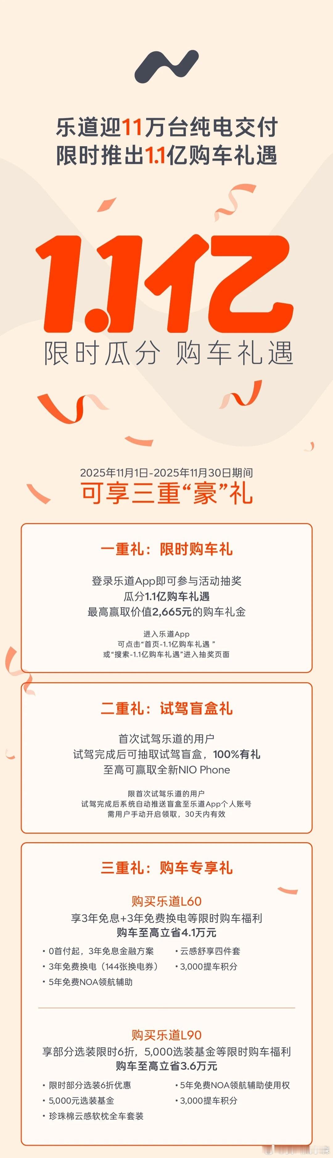 即日起至11月30日,登陆乐道App、参与试驾或购买乐道,可享限时福利,包括瓜分1.1亿购车礼遇、赢取全新NIO Phone、购买L60/L90至高立省4.1万元/3.6万元等