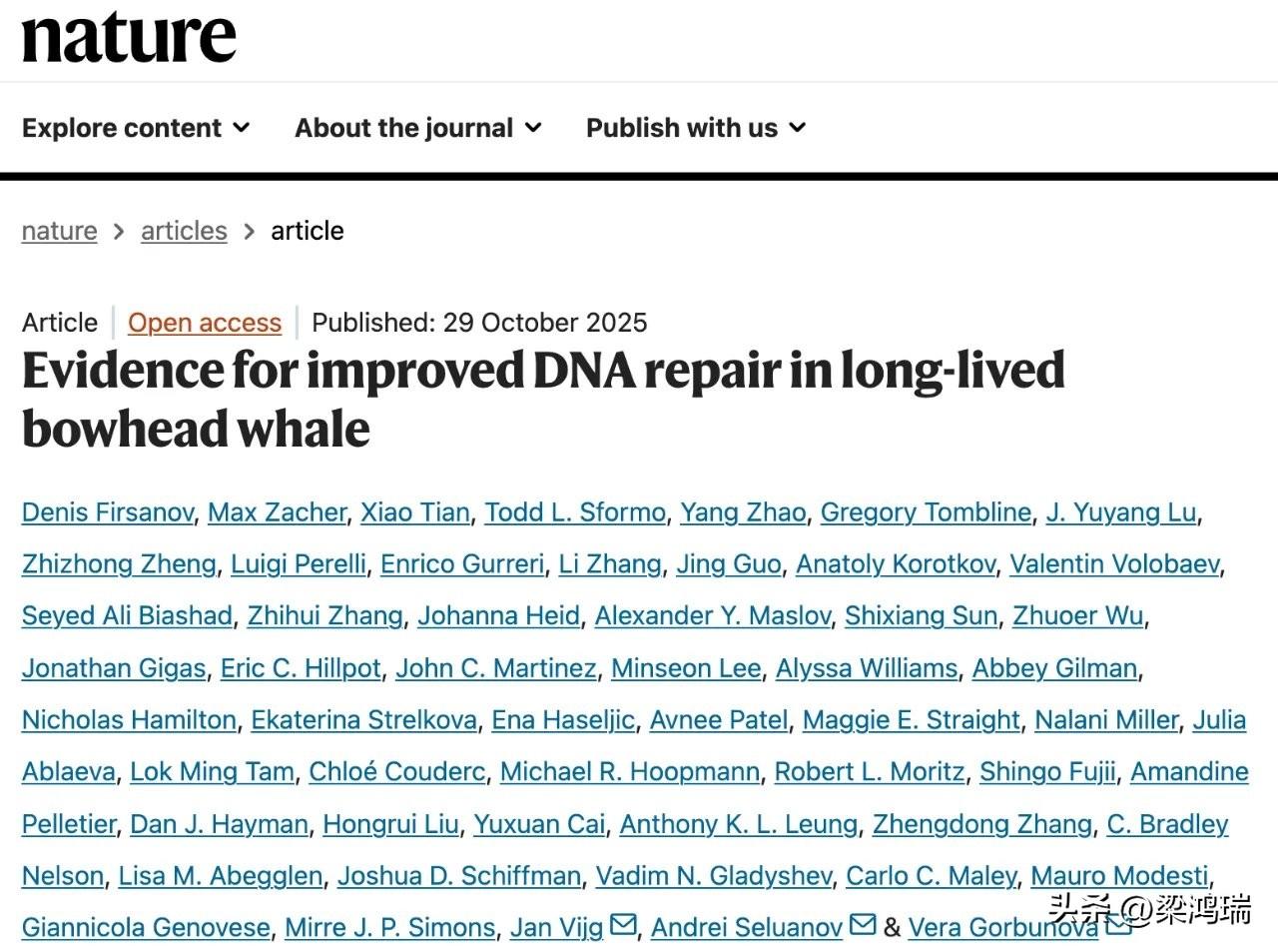 2025 年 10 月 29 日,美国罗切斯特大学和美国阿尔伯特·爱因斯坦医学院的研究人员合作,在国际顶尖学术期刊《Nature》 上发表研究论文。 该研究揭示了弓头鲸拥有 200 年超长寿命且不患癌症的原因之一:一种在寒冷环境中被激活的蛋白质——寒冷诱导的 RNA 结合蛋白(Cold-inducible RNA-binding Protein,简称为 CIRBP),该蛋白有助于修复 DNA 双链断裂,提高基因组稳定性,从而赋予其极长寿命和极低的癌症风险。 研究还发现,在人类细胞中表达 CIRBP 蛋白,能够提高人类细胞的 DNA 修复能力,在果蝇体内表达该蛋白,则能够延长其寿命,还能增强其对导致 DNA 突变的辐射的抵抗力。 这些发现提示了 DNA 修复对于长寿和癌症预防的重要性,也提示了我们,通过提升 DNA 修复能力,人类还有延长寿命和改善健康的巨大空间。 罗切斯特大学是一所综合性研究型大学,学科门类众多, 校友或教职员工中共有13名诺贝尔奖得主。在各类美国大学排名中常年位居前列;而阿尔伯特·爱因斯坦医学院则是一所专注于医学领域、高度专业化的医学院。两所学校在纽约州的不同城市,各自在高等教育和医学研究领域拥有卓越的声誉和特点。