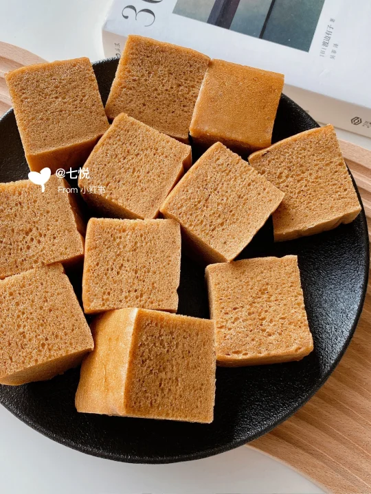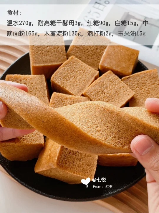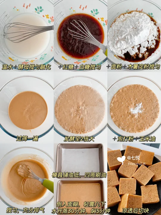 红糖马拉糕试了好几个配方 [斜眼R]这次终于满意了,吃起来口感Q弹软糯,甜而不腻 配方分享给你们~ - 🌿食材: 温水270g,耐高糖干酵母3g,红糖90g,白糖15g,中筋面粉165g,木薯淀粉135g,泡打粉2g,玉米油15g - 🌿做法: 1️⃣温水➕酵母搅匀融化,➕红糖➕白糖搅匀,➕中筋面粉➕木薯淀粉搅匀 2️⃣过筛一遍,温暖处发酵至2倍大(建议28度1小时) 3️⃣➕泡打粉➕玉米油,搅拌均匀,充分排气 4️⃣模具底部铺油纸,四周刷油,倒入面糊,轻震几下去掉大气泡 5️⃣水开后上锅,中大火蒸30分钟,焖5分钟,出锅脱模,凉透后切块 - ❤️tips: ▪️我的模具大小是20*15cm ▪️温水温度在30 ℃~45 ℃左右 ▪️一定要凉透后再切,一刀切到底,不要来回切