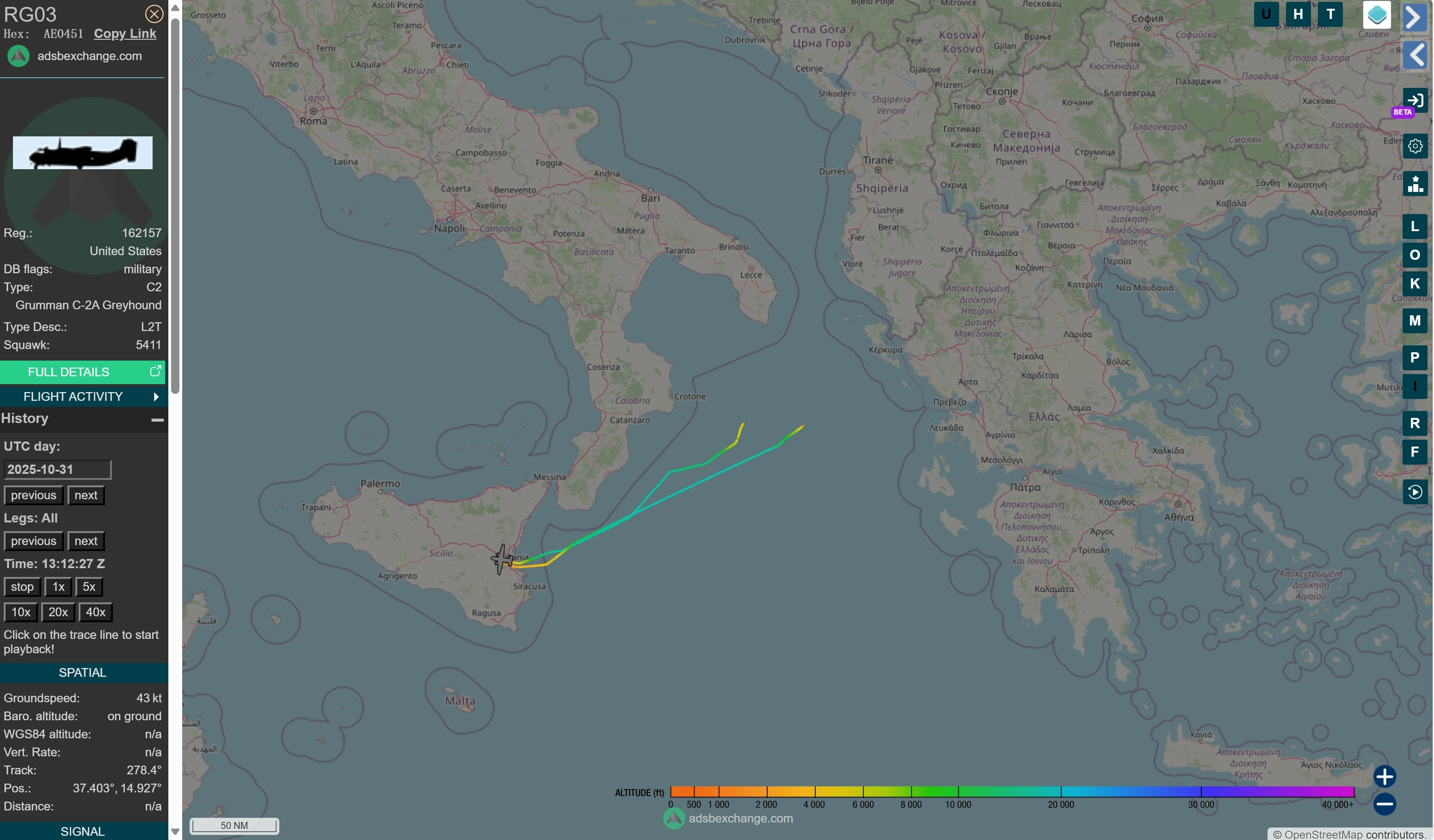 此外,美国还向加勒比海增派了福特号(CVN-78)航母打击群,不过C-2A的飞行活动显示,10月31号,福特号仍位于意大利附近的爱奥尼奥海(图6),并未急于前往加勒比海,而从爱奥尼奥海赶往加勒比海,还需需要两周左右的时间。