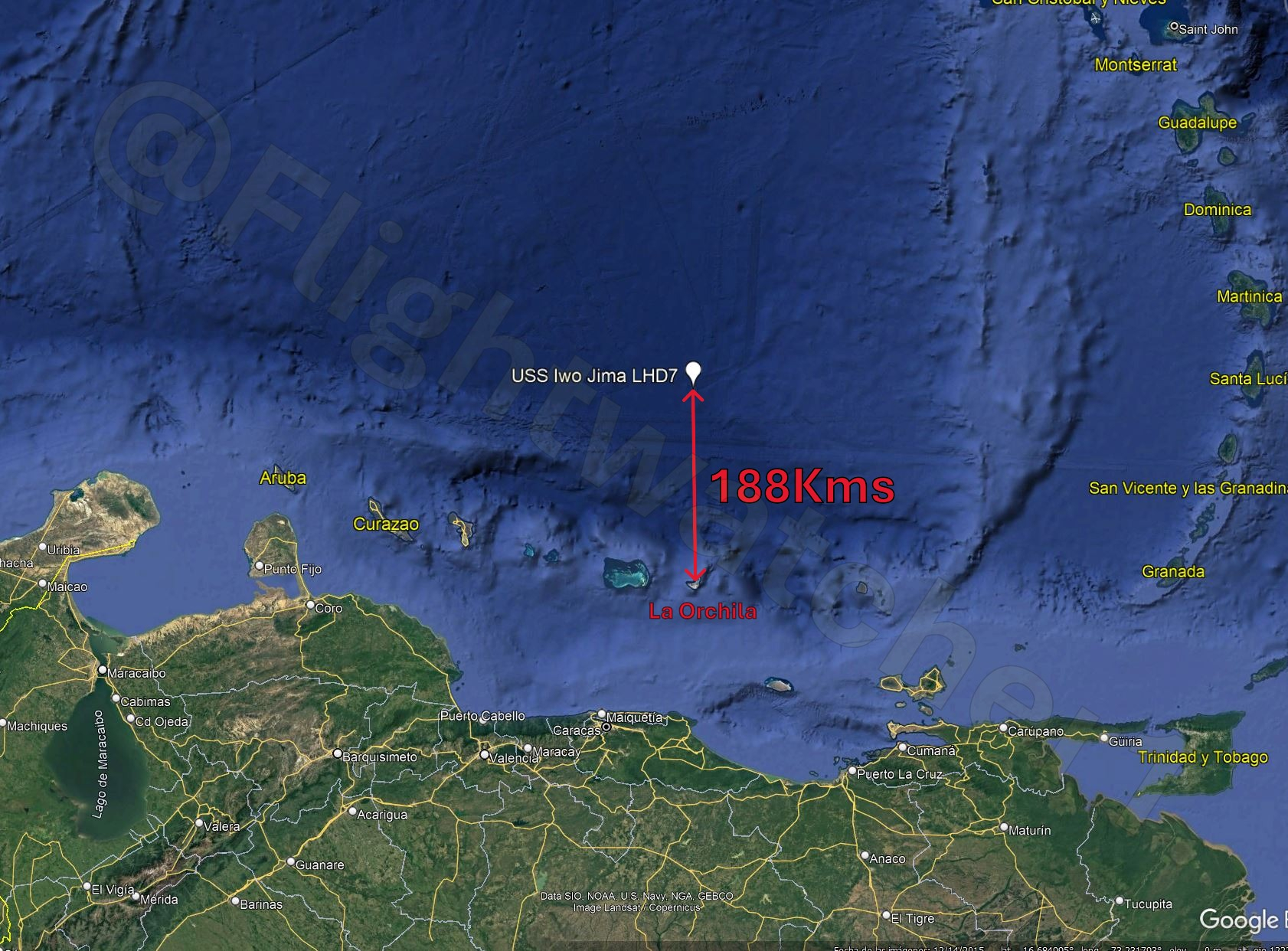 目前,美军在加勒比海地区部署1艘黄蜂级两栖攻击舰硫磺岛号(LHD-7),数艘阿利伯克级驱逐舰等,10月30号,硫磺岛号被发现位于委内瑞拉拉奥奇拉岛以北约188公里处(图3~图5)。