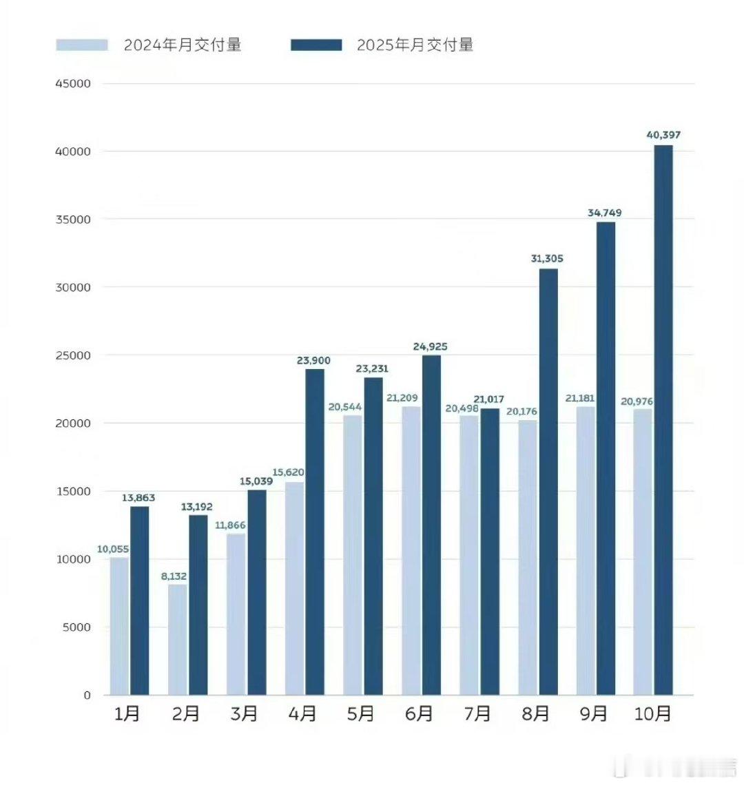 蔚来月销首破4万创新高蔚来10月交付量达40397台,同比暴涨92.6%,首次突破4万月销大关。蔚来、乐道、萤火虫三品牌齐发力,其中全新ES8交付超万台,乐道L90连续三月居纯电大型SUV销量榜首,销量曲线陡峭攀升。