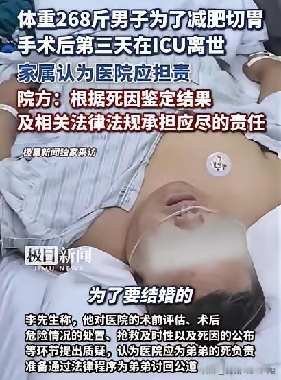 郑州一体重268斤男子,谈了个女友!于是想减减肥见家长,为了快速减肥,他去医院做减肥切胃手术,随后住进ICU观察,结果,手术后第3天,他在ICU不幸离世!家属认为医院应担责,院方:根据死因鉴定结果及相关法律法规承担应尽的责任! 这个叫李江的36岁小伙绝对想不到,一次看似常规的减肥手术会让他再也见不到心爱的女友。身高174厘米、体重134公斤的他,为了以更好形象去见女方家长,选择了一种最极端的方式——切胃手术。悲剧就这样发生了,10月4日早上6点50分,他出现呼吸暂停、意识丧失,被紧急送进ICU,第二天早上7点36分宣告死亡,死亡原因写着简单的三个字:呼吸衰竭。 医院口口声声说手术有明确指征,术前评估没发现问题,五分钟内就把患者送进了ICU,一切都符合医疗规范。冰冷的官方回应与一个鲜活生命的消逝形成了刺眼对比。切胃手术从来不是小手术,它可能引发出血、感染、吻合口漏等严重并发症,甚至会永久改变人体的营养吸收功能。医院是否真的让李江充分意识到了这些风险? 李江的案例揭示了我们社会对肥胖问题的狭隘认知。一个人因为体重问题感到自卑,甚至需要通过切除部分胃部来获得认同,这本身就是个悲剧。减肥市场充斥着各种急功近利的解决方案,却很少有人强调健康饮食和规律运动才是科学途径。某种程度上,李江也是这种浮躁氛围的受害者。 医疗事故鉴定和法院判决可能需时数月甚至数年,但生命只有一次。医院表示会“根据鉴定结果承担应尽的责任”,这种标准回应能否给逝者一个公道?当家属质疑抢救及时性时,医院如何证明自己真的做到了最佳应对? 类似的医疗纠纷并非个例。上海一起抽脂手术案例中,法院认定医院过度抽吸导致患者臀部凹陷,即使患者签署了知情同意书,医院仍需承担80%赔偿责任。知情同意书不是医院的“免责金牌”,它不能免除医护人员应尽的专业责任。 切胃减肥带来的危害是多方面的,包括营养不良、消化功能紊乱、倾倒综合征等。这些长期影响往往被急于减肥的人忽视。李江的故事应该成为一个警示,提醒我们反思对肥胖的偏见,重新审视快速减肥手术的风险收益比。 各位读者你们怎么看?欢迎在评论区讨论。