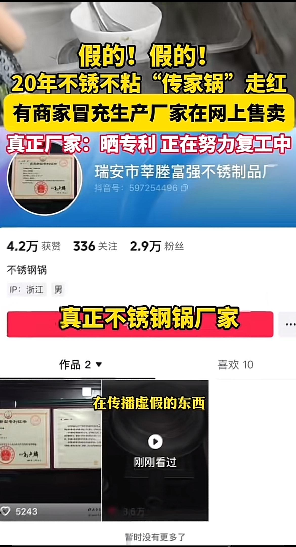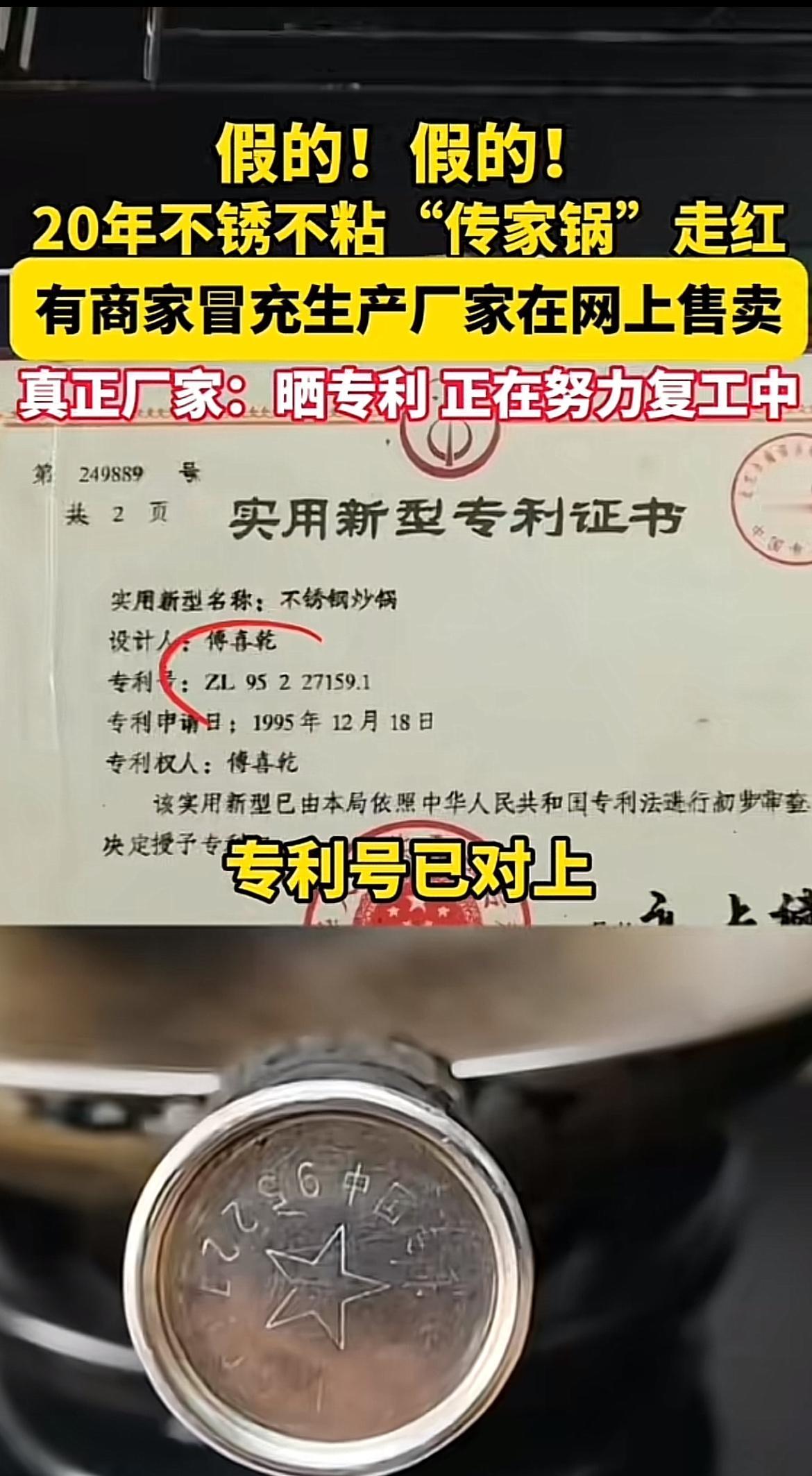 最近一个20年不锈不粘的“传家锅”火了。网友陈女士发视频说自家炒锅用了二十多年,不生锈还不粘,想再买个同款,视频点赞超40万。好多网友留言想买,还有人根据专利号找厂家。 记者查到厂家是浙江瑞安的不锈钢制品厂,负责人傅先生忙得不可开交,好多人打电话、加微信求购。原来上世纪九十年代初,工厂手工打造锅具,用进口不锈钢,氩弧焊焊接,处理细致、用料扎实,所以锅质量好、耐用。 不过陈女士也头疼,几十家都称是厂家,她没法确认,只能说自己的锅好用。厂家在努力复产,大家也得理性辨别,别被“李鬼”骗了。