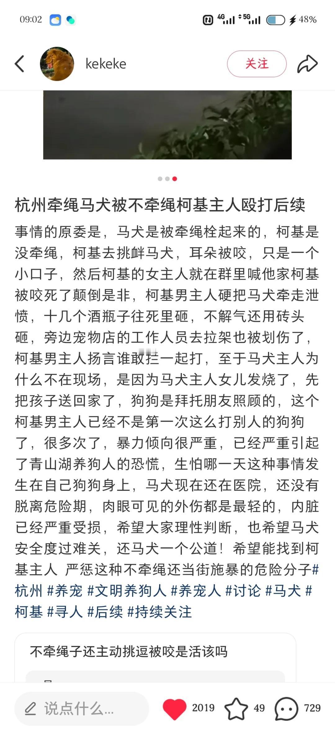 严惩凶手! 昨天刷到打马犬视频,还以为又是虐狗人打自己的狗,无能为力,叫声凄惨,匆匆刷过。 今天刷到了后续,没想到居然是这样,一向听说杭州对狗管制比较严格,牵绳有证的马犬被无证没牵绳的柯基挑衅,被暴力狂的柯基主人当街虐打,阻拦的人也被划伤,马犬仍在抢救,还听说暴力狂之前就摔死了一只柯基。暴力狂还大言不惭在家美美吃食物,女主人也是忠贞不渝,浙农大已经隐私账号了。 一个暴力狂祸害一整片区域,为青山湖的养宠人感到担心,也特别害怕以后会遇到这种人,请求警方能够给这种人最大的惩罚措施,千万不要冷处理! @杭州网警 @浙江农业大学校园君 必须严惩坏人 案件 坚决打击犯罪 不做冷漠的看客 任何邪恶终将绳之以法 总会有人站出来 想让更多人看到 杭州马犬