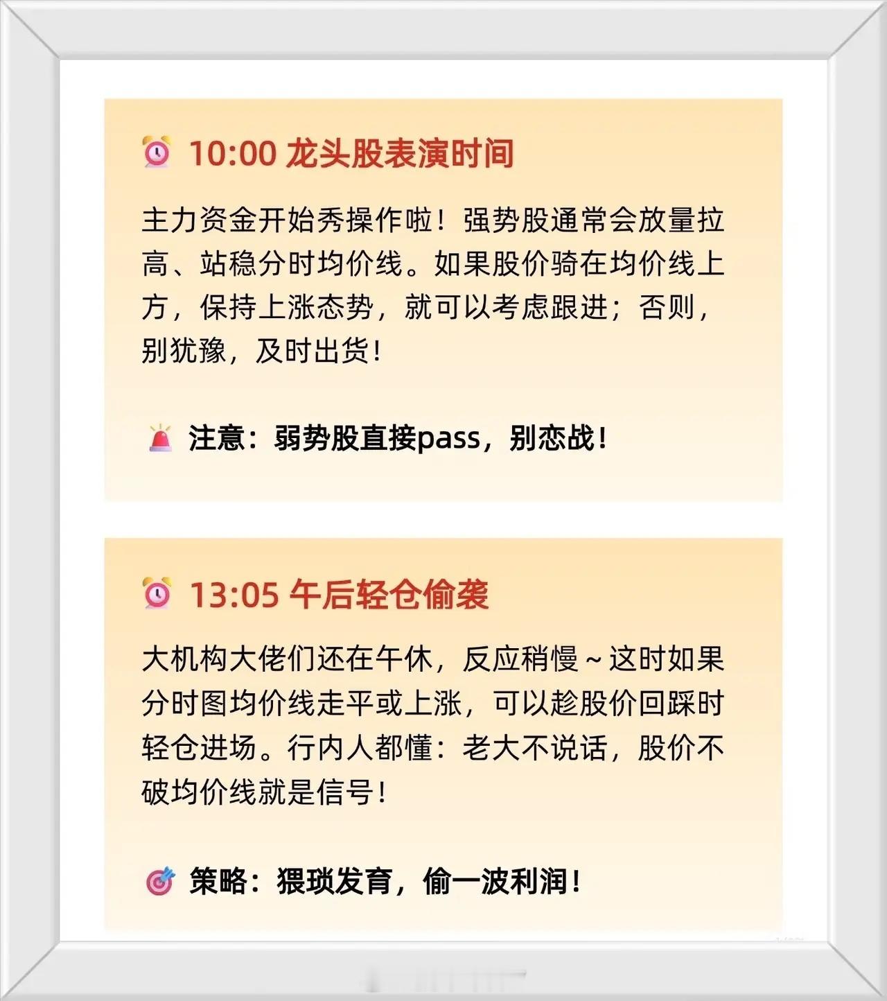 - 时机:大机构午休期间,若分时图均价线走平或上涨,股价回踩均价线→轻仓进场。