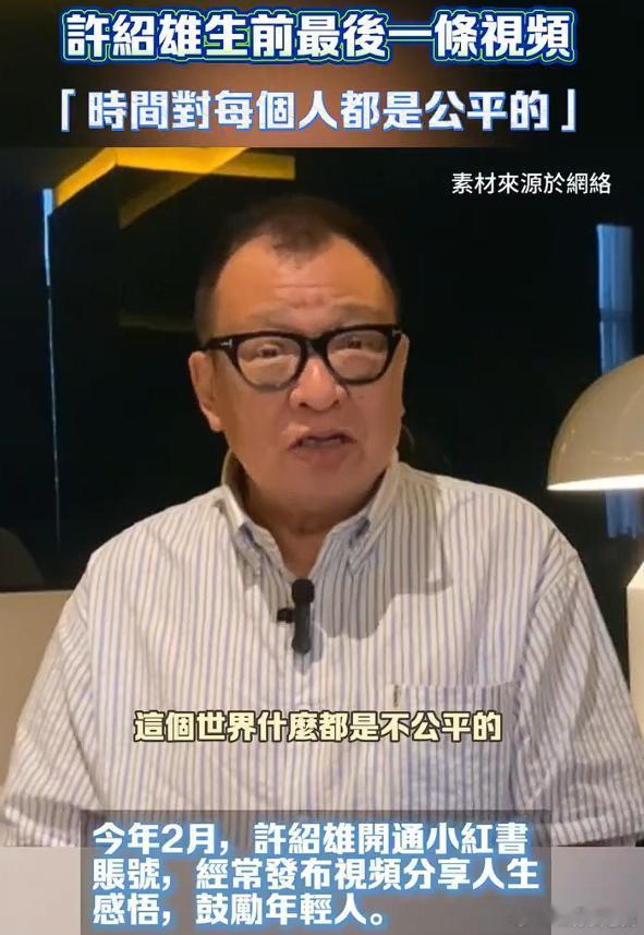 他的敬业与担当,在病重期间也未曾改变。许绍雄生前从未向外界透露自己罹患癌症的消息,直到离世后,公众才知晓他早已被病魔困扰。他最后一条社交平台视频发布于十几天前,画面中他面色略显苍白,但眼神依旧平和,缓缓说道:“这个世界很多不公平,但时间是最公平的”,话语中透着对生活的通透与释然。即便在病痛中,他也未利用病情博取同情,而是以平静的姿态与世界告别。