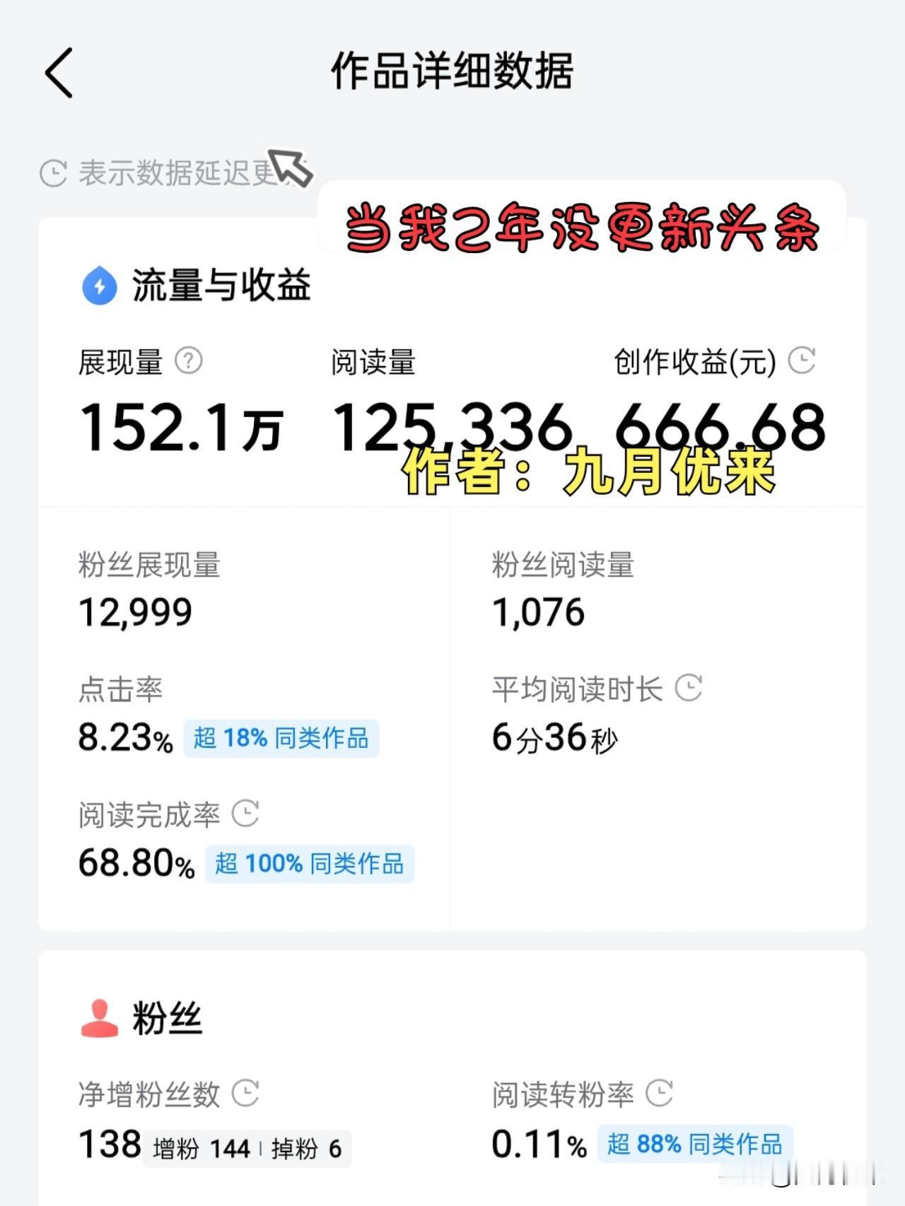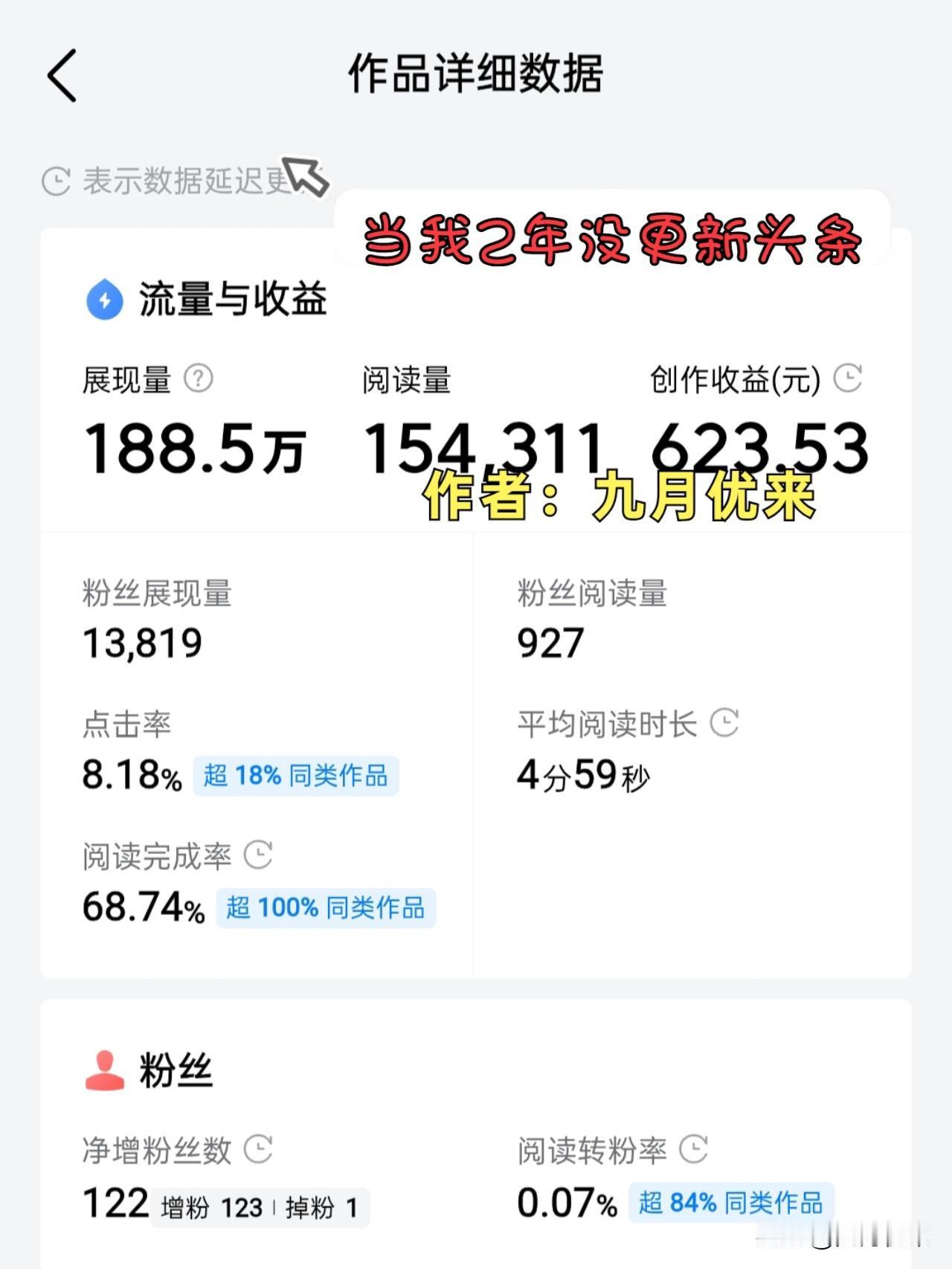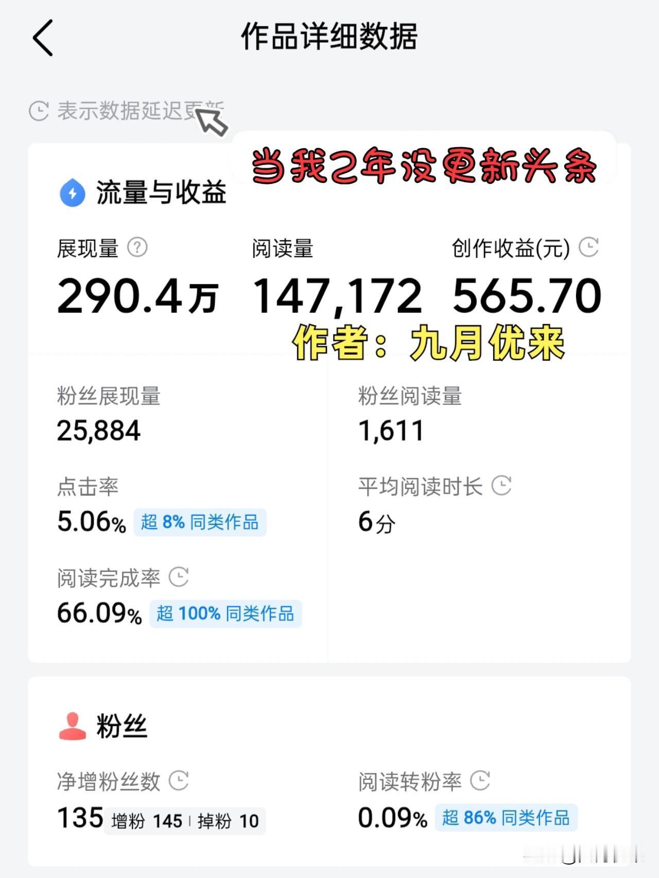 2年没更新今日头条了,以前一篇文章百元很轻松,隔一天两天能爆一篇,收益500到1000左右很正常。 这两天手痒,想重新开始写文章,前两天还好,10月1,2号是星期六和星期天,我发现平台好像出Bug了。 前6张图是两年前的,后三张图是现在的,周六和周日的,第6张图点赞大于阅读量,这个我们可以理解成,也行是误点,或者是点赞之后没有看,观看时长不够。 第7张图13000的推荐量,6个阅读,推荐量给的很快,几分钟再打开看的时候,涨到18000的推荐量,阅读量仍然是6个,这是不合乎常理的,正常的推荐量和阅读量应该在10%。不知道大家有没有这种情况? 我现在的千次播放单价也很少,因为两年没有更新,我的认证已经被取消,单价少也可以理解,第一天更新的时候,千次阅读单价在1.9,目前两天感觉平台虽然出了bug,但是千次单价已经上到4.5。 写头条还是要持之以恒,断更真的会影响账号,以后我不会再关注流量和收益,认真的写好每篇文章,先把认证找回来,以后有变化也会给大家分享。 最近看到好多老朋友,老粉丝还在默默支持我,在这里说声谢谢,也说说这两年为什么不更新,并不是我不想更新,是没时间。 两年前在头条写民间故事,还做抖音小程序,后来做电商,自己运营,拍摄,剪辑,打包,发货,就把头条放下了。 不知道当时好友,常常聊天的粉丝都还在头条不? 最后我想说,如果你现在正在做头条,别管收益,流量这些东西,坚持的去做就好,自媒体写作,没有永远都好的时候,也没有永远都差的时候,一个持之以恒的心最重要,大家加油‼️