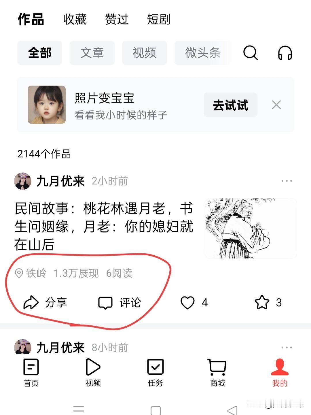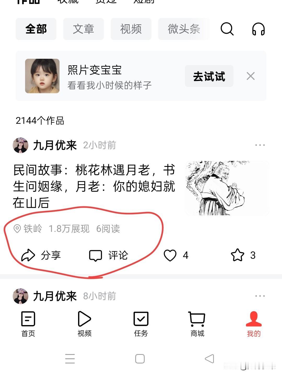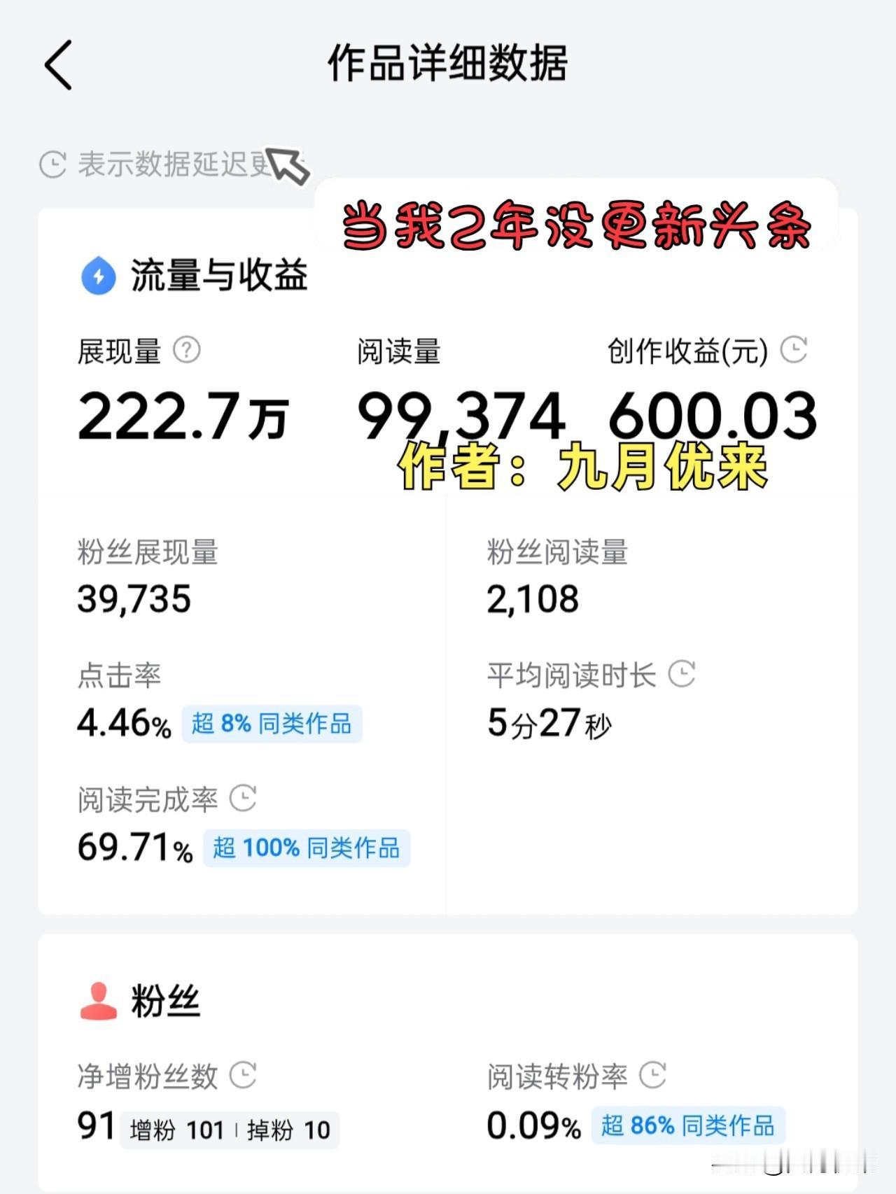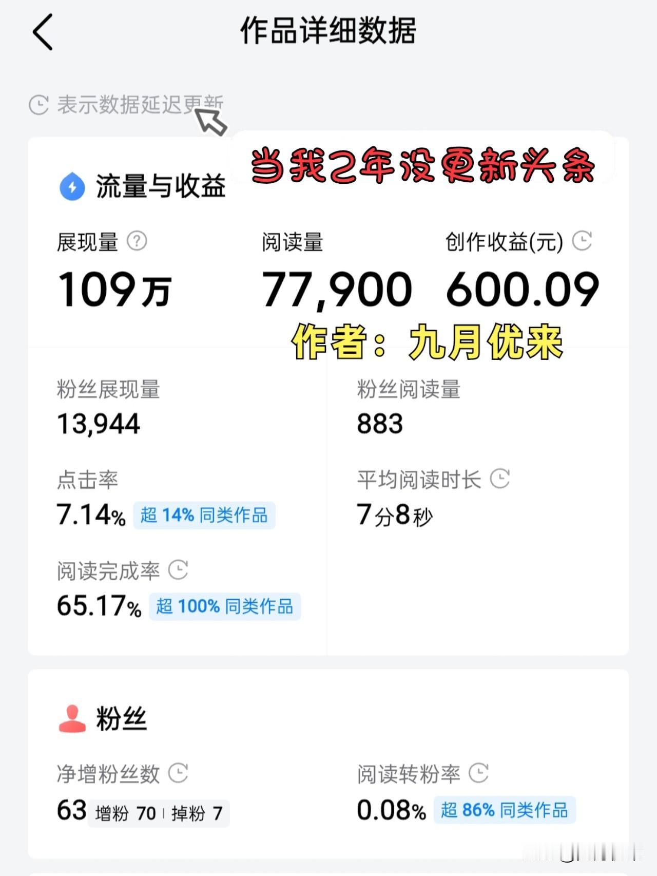 2年没更新今日头条了,以前一篇文章百元很轻松,隔一天两天能爆一篇,收益500到1000左右很正常。 这两天手痒,想重新开始写文章,前两天还好,10月1,2号是星期六和星期天,我发现平台好像出Bug了。 前6张图是两年前的,后三张图是现在的,周六和周日的,第6张图点赞大于阅读量,这个我们可以理解成,也行是误点,或者是点赞之后没有看,观看时长不够。 第7张图13000的推荐量,6个阅读,推荐量给的很快,几分钟再打开看的时候,涨到18000的推荐量,阅读量仍然是6个,这是不合乎常理的,正常的推荐量和阅读量应该在10%。不知道大家有没有这种情况? 我现在的千次播放单价也很少,因为两年没有更新,我的认证已经被取消,单价少也可以理解,第一天更新的时候,千次阅读单价在1.9,目前两天感觉平台虽然出了bug,但是千次单价已经上到4.5。 写头条还是要持之以恒,断更真的会影响账号,以后我不会再关注流量和收益,认真的写好每篇文章,先把认证找回来,以后有变化也会给大家分享。 最近看到好多老朋友,老粉丝还在默默支持我,在这里说声谢谢,也说说这两年为什么不更新,并不是我不想更新,是没时间。 两年前在头条写民间故事,还做抖音小程序,后来做电商,自己运营,拍摄,剪辑,打包,发货,就把头条放下了。 不知道当时好友,常常聊天的粉丝都还在头条不? 最后我想说,如果你现在正在做头条,别管收益,流量这些东西,坚持的去做就好,自媒体写作,没有永远都好的时候,也没有永远都差的时候,一个持之以恒的心最重要,大家加油‼️