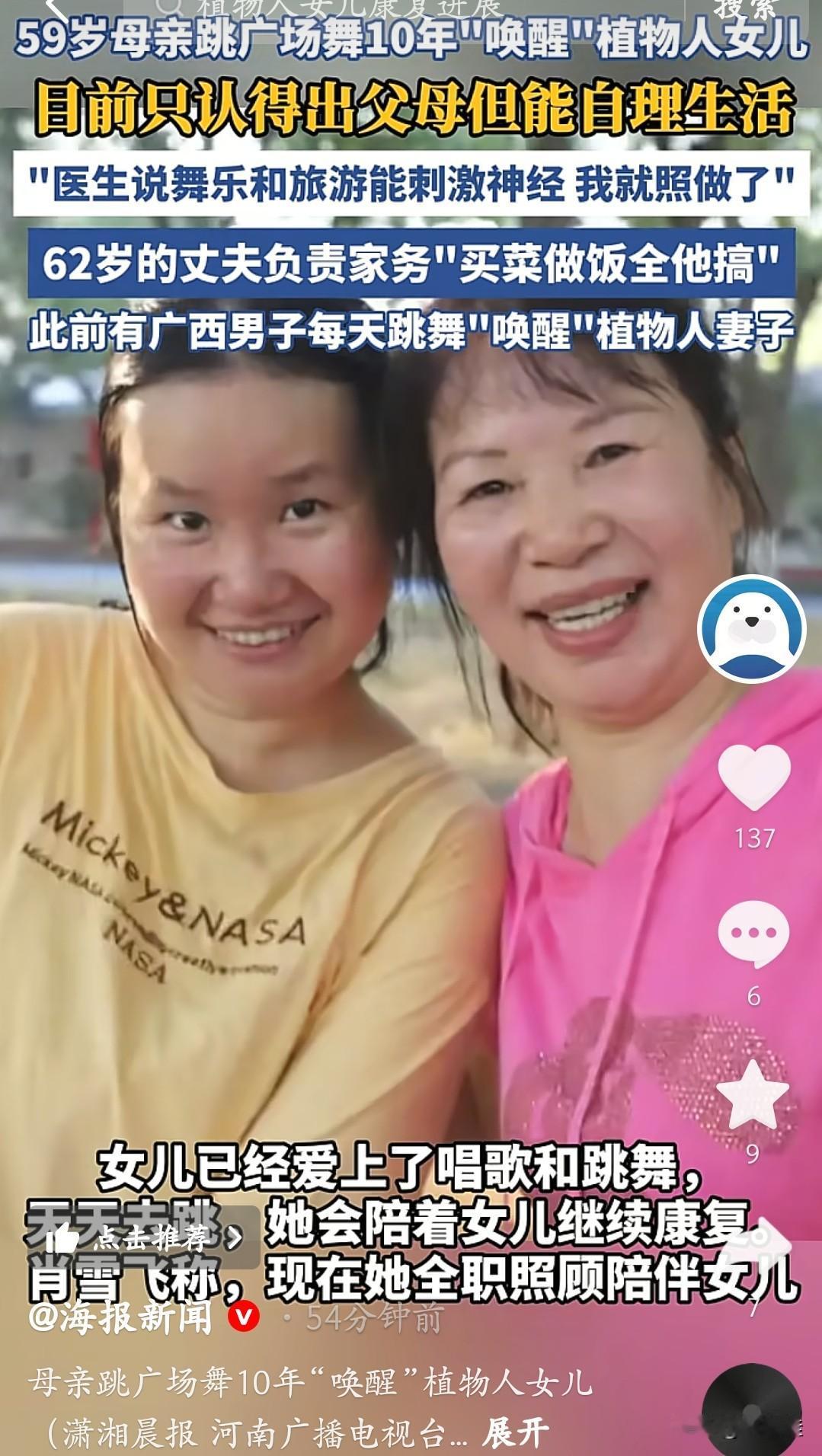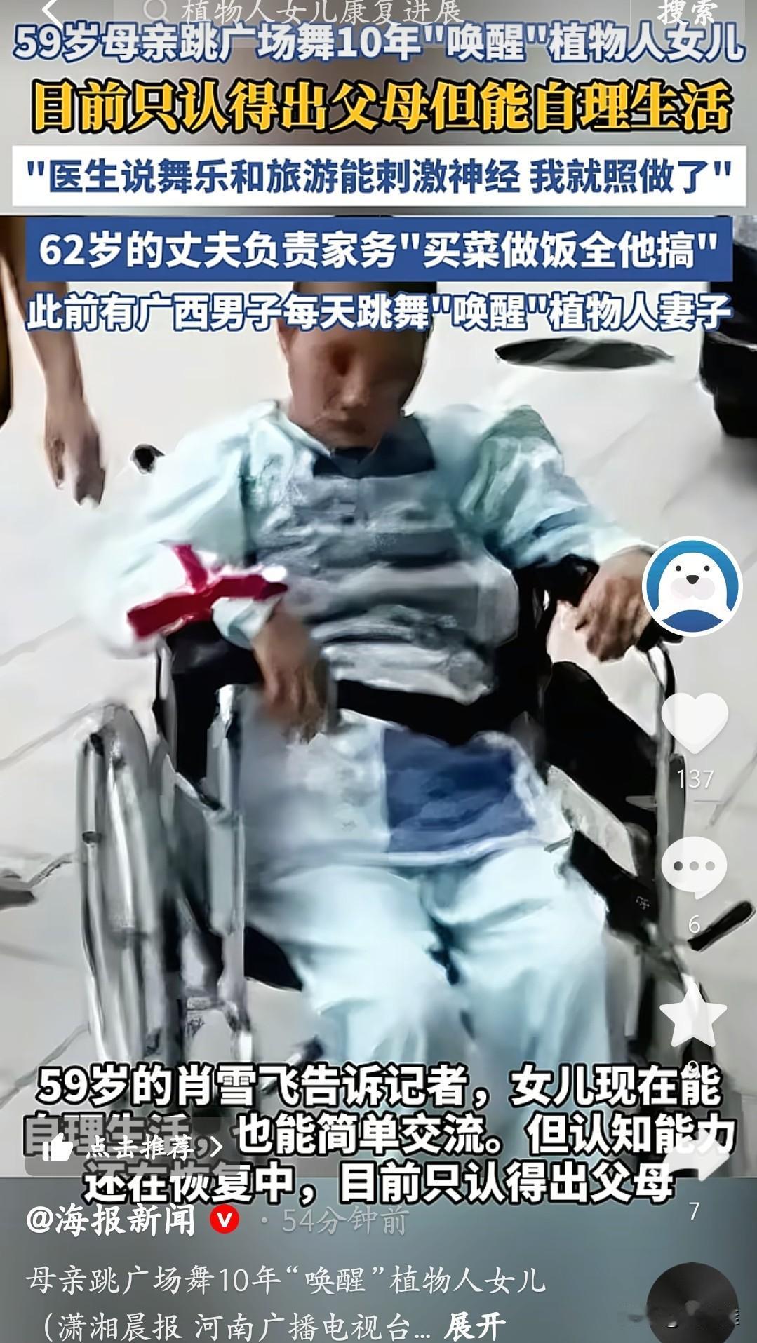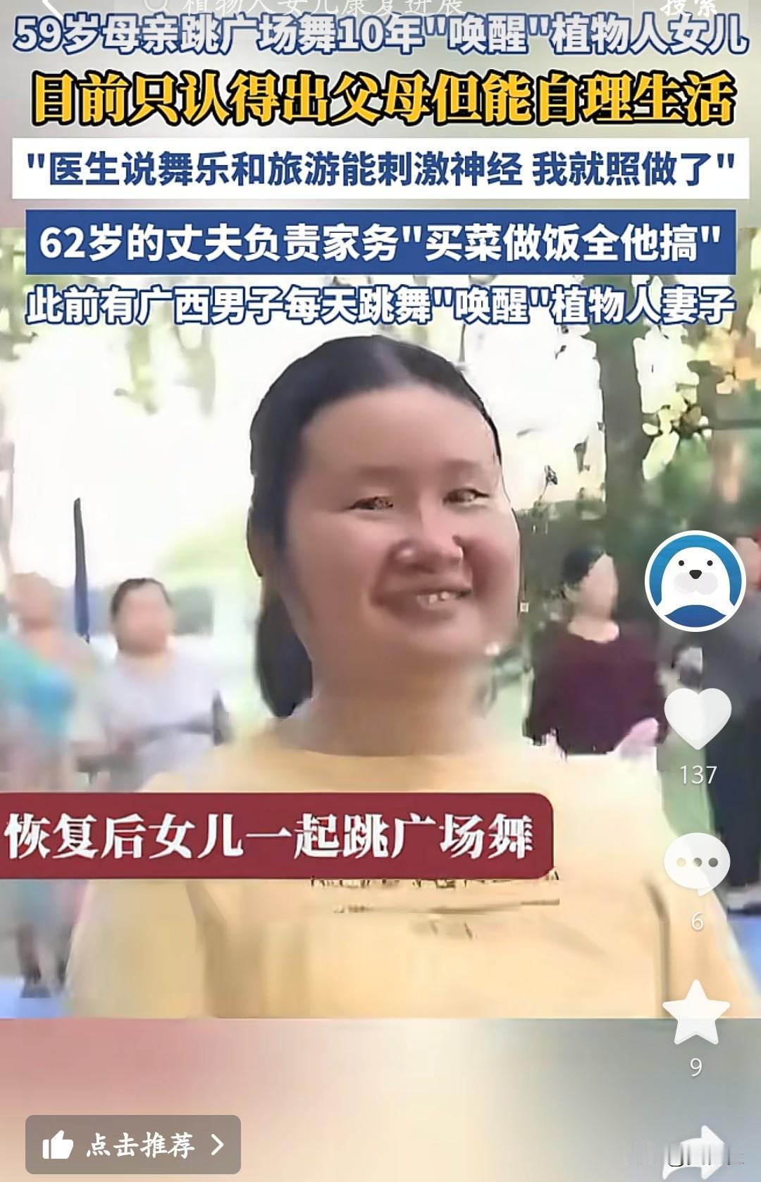 59岁妈妈跳广场舞10年,居然把植物人女儿‘唤醒’了!母爱太伟大了! 你敢信吗?这位肖雪飞阿姨的女儿成了植物人,医生说舞乐和旅游能刺激神经,她就真的坚持跳了十年广场舞,还带着女儿到处走。她62岁的老公也超给力,把买菜做饭的家务全扛了。 现在女儿能自理生活,还能简单交流,虽然只认得出爸妈,但已经爱上唱歌跳舞,天天跟着妈妈跳广场舞。这十年的坚持太不容易了,一家人的付出终于有了回报,这种母爱和家庭的力量真的太让人感动了!