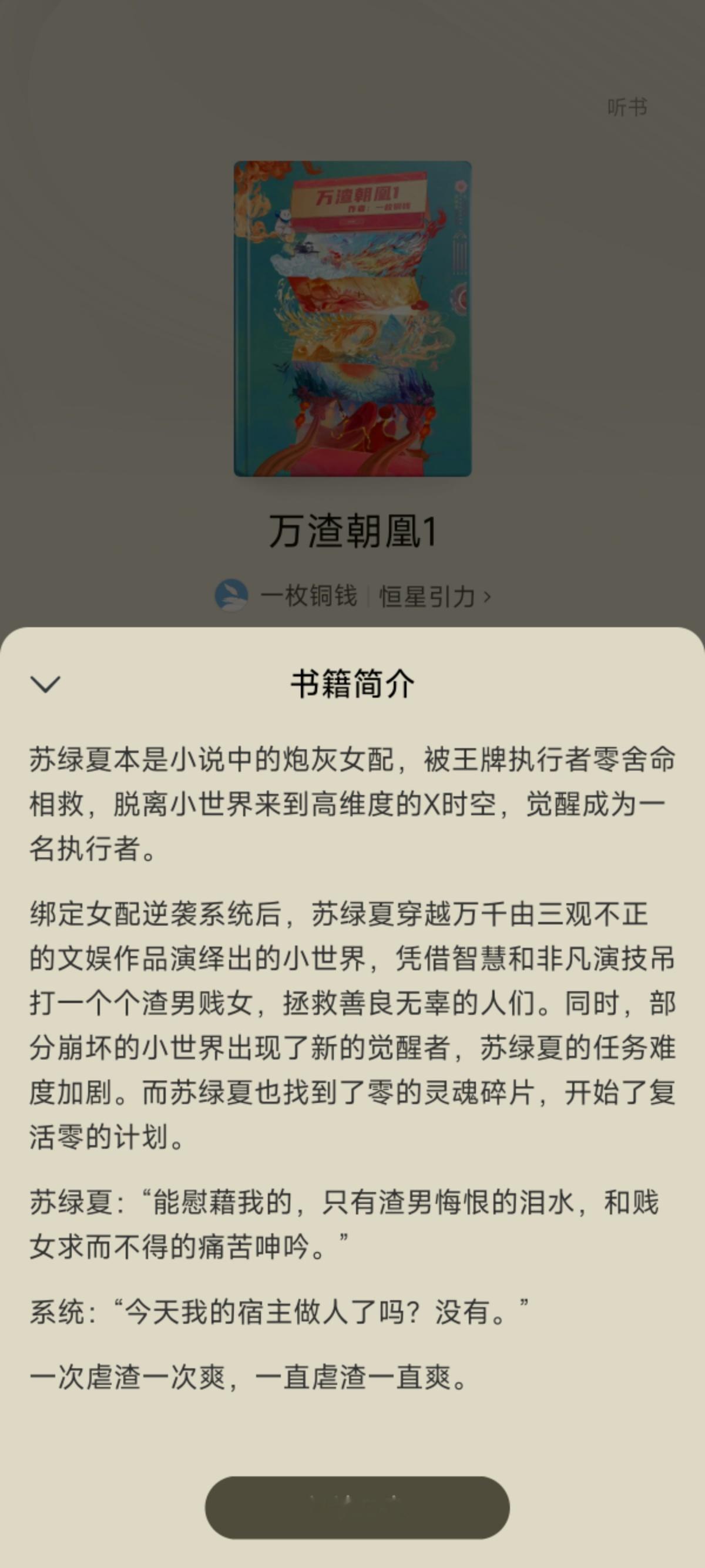 刚看了《万渣朝凰》电子书,真的被狠狠爽到!御姐苏绿夏绑定系统,快穿N个世界花式吊打渣男绿茶!之前就挺喜欢一枚铜钱的文笔,感觉她签约后写的东西更稳了!