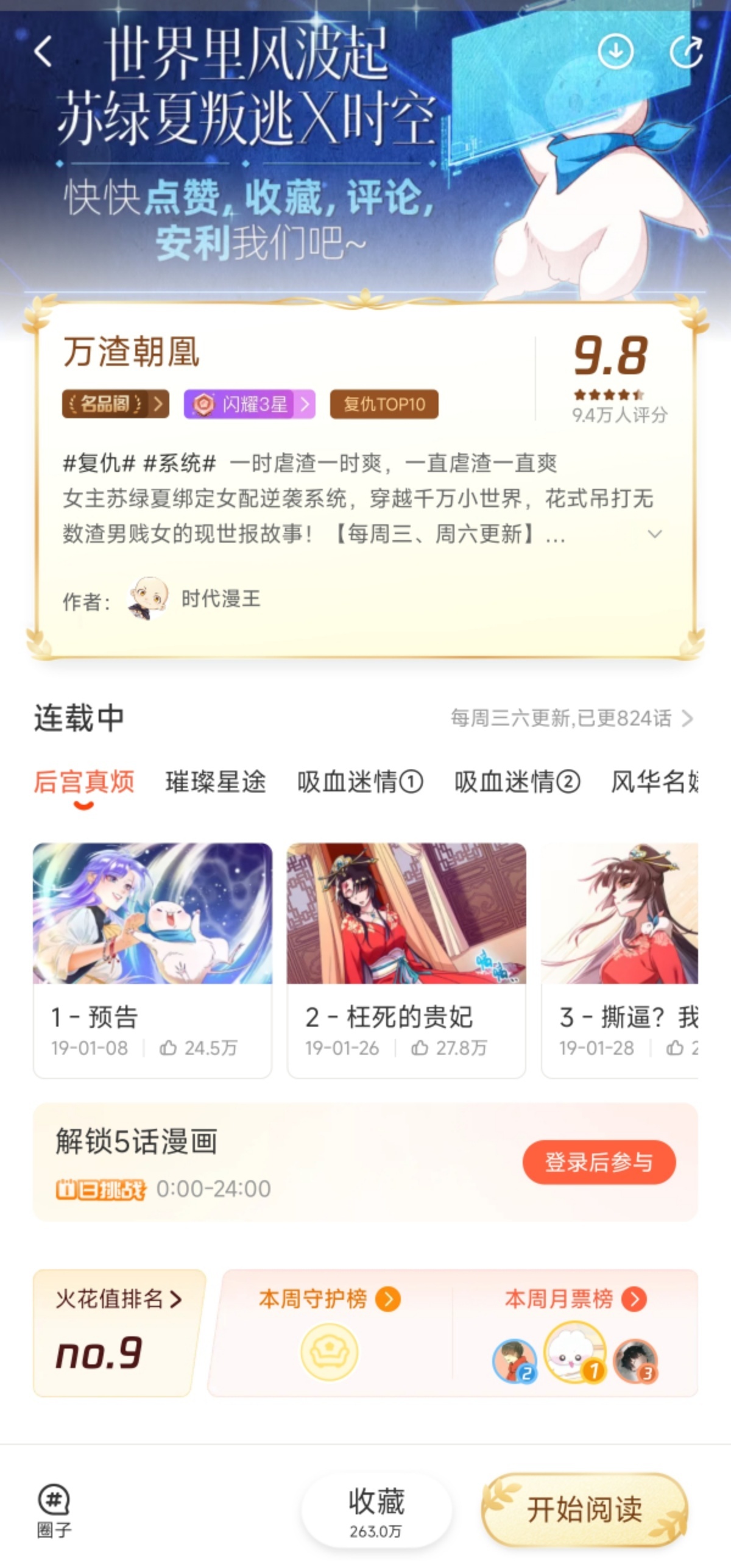 又去腾讯动漫看了眼《万渣朝凰》,9.8的评分真挺高了!而且现在整个系列越来越丰富,动漫有了,剧版《万花世界》也官宣了,电子书实体书也都安排上了!