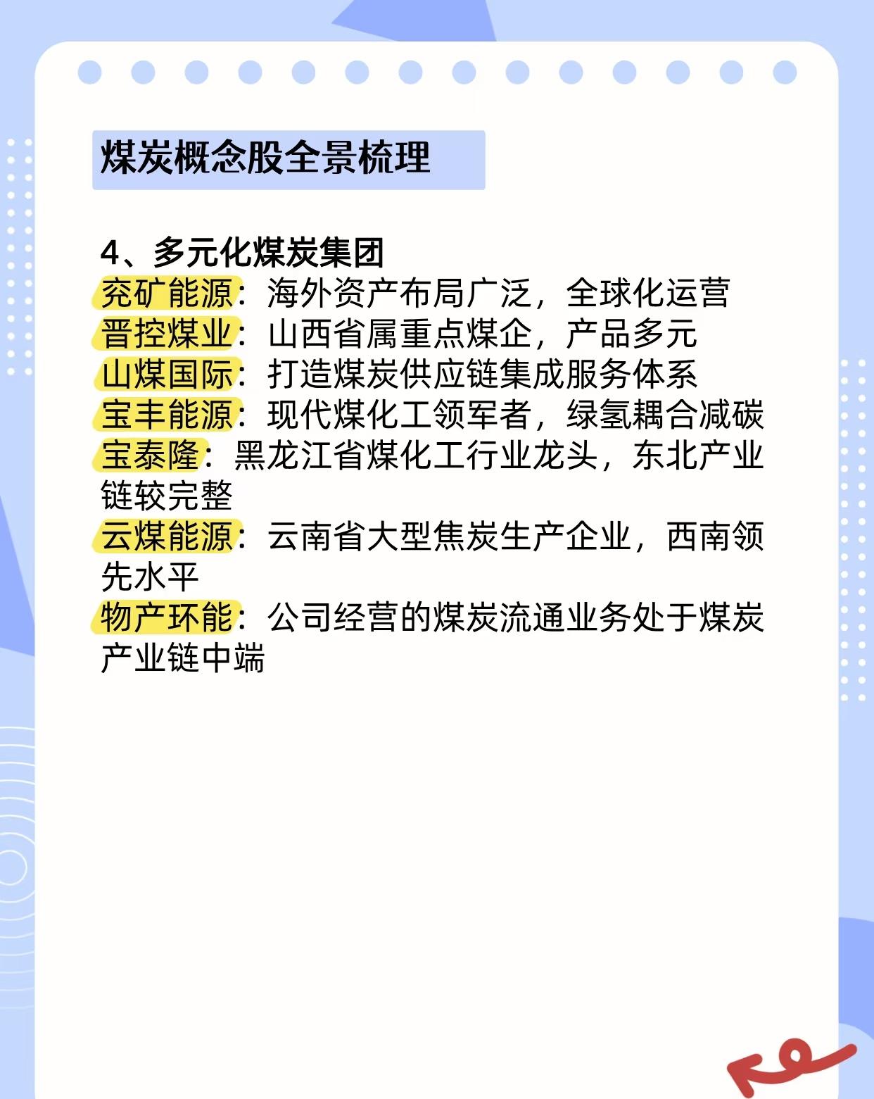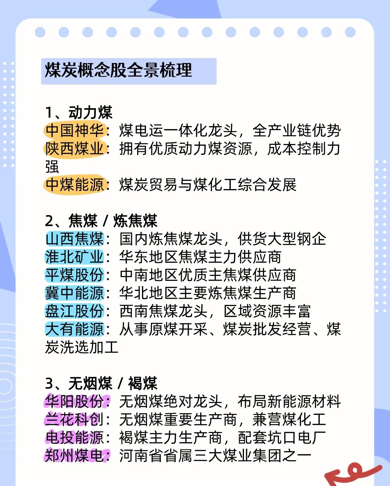 一、煤炭股看涨的六大核心逻辑 1. 国内政策调控,优化供给结构:国家推动“反内卷”,关闭落后产能,尤其是小型煤矿,供给收紧支撑煤价。 2. 美国新能源投资调整:美国部分新能源投资放缓或关闭,间接影响全球能源结构,有利于传统能源如煤炭的需求稳定甚至回升。 3. 芯片与算力用电需求激增:随着AI、芯片等高科技产业快速发展,算力中心等耗电量巨大,今年全国用电量创出新高,带动电力及动力煤需求。 4. 资金偏好转向高分红板块:资本市场出现资金从高估值赛道向稳定高分红板块切换的趋势,煤炭作为传统高分红行业受到大资金青睐。 5. 低利率环境促使存款搬家:在低利率甚至负利率背景下,居民及机构倾向于将存款转移至能提供稳定收益的红利资产,比如煤炭股。 6. 美联储降息预期推升大宗商品价格:当前处于美联储降息周期,通常利好大宗商品,煤炭作为重要的大宗商品之一,价格有望上行。 二、煤炭概念股分类梳理 图片中对煤炭相关上市公司进行了详细分类,主要包括以下几类: 1. 动力煤企业(主要用于发电): - 中国神华:煤电运一体化龙头,具备全产业链优势; - 陕西煤业:拥有优质动力煤资源,成本控制能力强; - 中煤能源:业务涵盖煤炭贸易与煤化工,发展较为综合。 2. 焦煤/炼焦煤企业(主要用于钢铁冶炼): - 山西焦煤:国内炼焦煤龙头,主要供货大型钢铁企业; - 淮北矿业:华东地区焦煤主要供应商; - 平煤股份:中南地区优质主焦煤供应商; - 冀中能源:华北地区主要炼焦煤生产商; - 盘江股份:西南地区焦煤龙头,区域资源优势明显; - 大有能源:从事原煤开采、洗选加工及煤炭批发。 3. 无烟煤/褐煤企业(特殊用途煤种): - 华阳股份:无烟煤领域绝对龙头,同时积极布局新能源材料; - 兰花科创:重要的无烟煤生产商,兼顾煤化工业务; - 电投能源:褐煤主要生产商,配有坑口电厂实现资源整合; - 郑州煤电:河南省属三大煤业集团之一。 4. 多元化煤炭集团(业务覆盖面广,多领域布局): - 兖矿能源:海外资产布局广泛,具备全球化运营能力; - 晋控煤业:山西省属重点煤炭企业,产品线较为多元; - 山煤国际:致力于打造煤炭供应链集成服务体系; - 宝丰能源:现代煤化工的领军企业,推进绿氢耦合减碳技术; - 宝泰隆:黑龙江煤化工行业龙头,产业链相对完整; - 云煤能源:云南地区大型焦炭生产企业,在西南地区具有领先地位; - 物产环能:专注于煤炭流通业务,处于煤炭产业链的中端环节。 总结: 综合三张图片信息可以看出,当前煤炭行业在政策调控、能源需求变化、资金偏好、宏观经济周期等多重因素作用下,具备看涨逻辑,尤其是在高分红、资源稀缺、用电需求增长的大背景下,煤炭股受到市场重点关注。同时,市场上主要煤炭相关企业按煤种和业务类型可分为动力煤、焦煤/炼焦煤、无烟煤/褐煤以及多元化煤炭集团四大类,每类均有代表性的龙头企业,具备不同的资源禀赋和产业链优势,为投资者提供了多样化的选择。