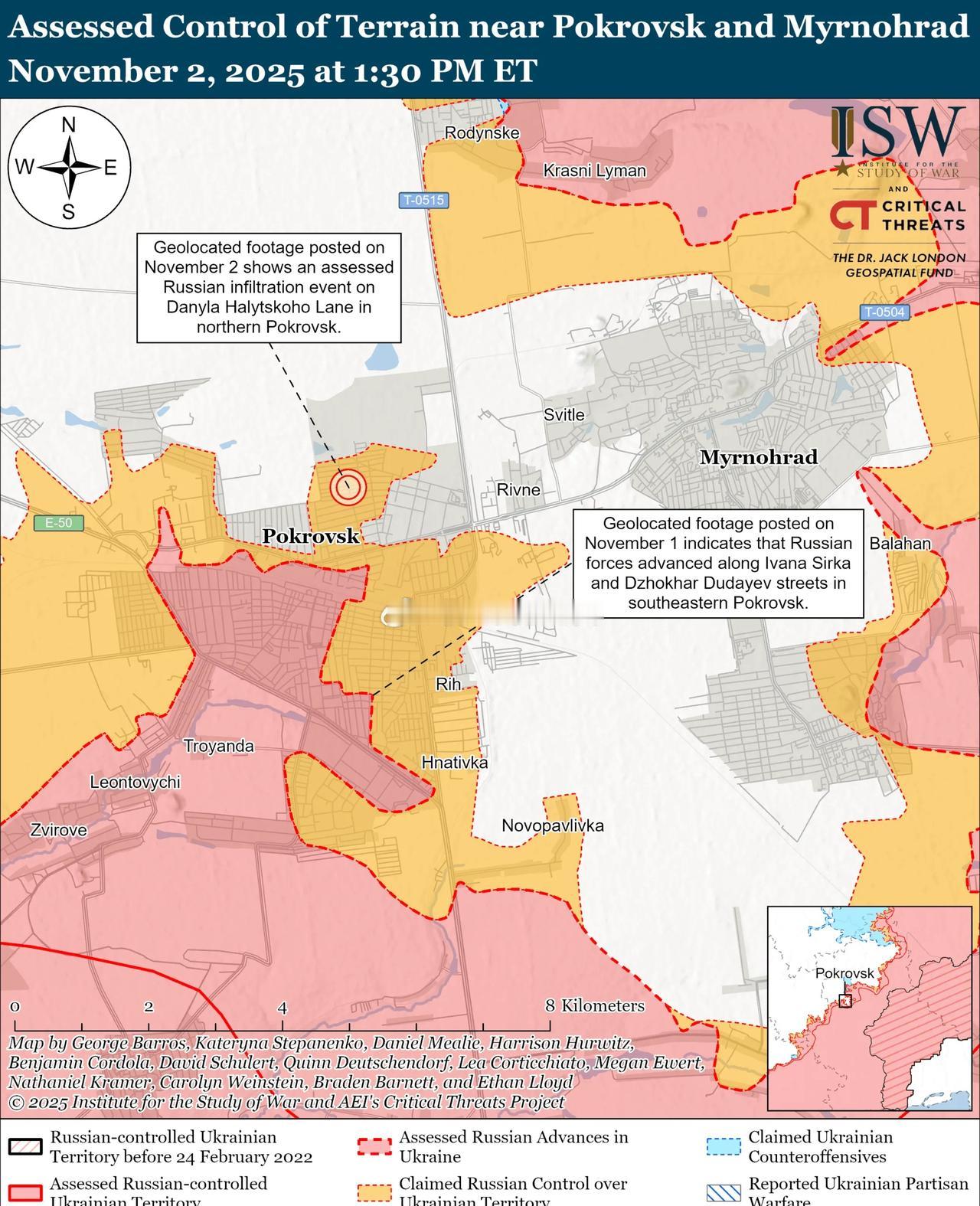 ISW战争研究院关于11月2日俄乌战事要点(文字版) (非战报视频日,会每日更新,涉部分敏感内容会进行删减或脱敏操作) 博主注;ISW战争研究院,对战线情况的记录还是比较准确的,但是在预测战况结果是会有西方倾向,如果是俄粉可以忽略掉看标有预测,推论字段的内容,关注战线字样的即可。 俄乌局势新进展烽火问鼎计划俄乌冲突 俄罗斯军队继续在波克罗夫斯克及其周边地区加强进攻行动,以占领该城镇并包围乌克兰守军。乌克兰和俄罗斯军队最近都在波克罗夫斯克地区取得了战术进展。(战线) 俄罗斯军队可能已经不再优先考虑科斯特扬季尼夫卡-德鲁日基夫卡战术区的进攻行动,转而完成夺取波克罗夫斯克和米尔诺赫拉德的任务。俄罗斯在波克罗夫斯克方向的突击战术造成了很高的伤亡率。(推论) 11月1日至2日晚,乌克兰军队远程袭击了俄罗斯的石油和电力基础设施。(战线) 比利时官员报告称,10 月 31 日至 11 月 2 日期间,比利时克莱纳布罗赫尔空军基地附近发生不明无人机入侵事件。(推论) 乌克兰军队最近向多布罗皮利亚战术区推进。俄罗斯军队最近向库皮扬斯克和波克罗夫斯克方向以及科斯特扬季尼夫卡-德鲁日基夫卡战术地区推进。(战线) ———————————————— 延伸——俄罗斯军队继续在波克罗夫斯克及其周边地区加强进攻行动,以占领该城镇并瓦解乌克兰包围圈。乌克兰和俄罗斯军队最近在波克罗夫斯克地区取得了战术进展。 11 月 1 日发布的地理定位视频显示,俄罗斯军队最近在波克罗夫斯克东南部推进。11 月 2 日发布的其他地理定位镜头显示,乌克兰军队在波克罗夫斯克北部袭击了两名正在执行渗透任务的俄罗斯士兵,ISW 评估该任务并未改变地形控制或战区前沿 (FEBA)。 乌克兰军方消息人士和俄罗斯军事博主最近表示,俄罗斯军队正在渗透到波克罗夫斯克北部。 俄罗斯军事博主声称,俄罗斯军队向波克罗夫斯克东北部、中部和南部推进;米尔诺赫拉德北部和东南部;以及 Hnativka 和 Rih 以南(均在波克罗夫斯克以东)。俄罗斯军事博主报道称,乌克兰军队收复了扎特肖克以北(波克罗夫斯克东北部)的领土。乌克兰总参谋部11月2日报道称,乌克兰军队在波克罗夫斯克方向的一个未指定区域收复了400平方米,很可能指的是最近在波克罗夫斯克北部和西北部的战术反击。