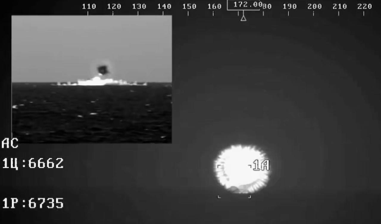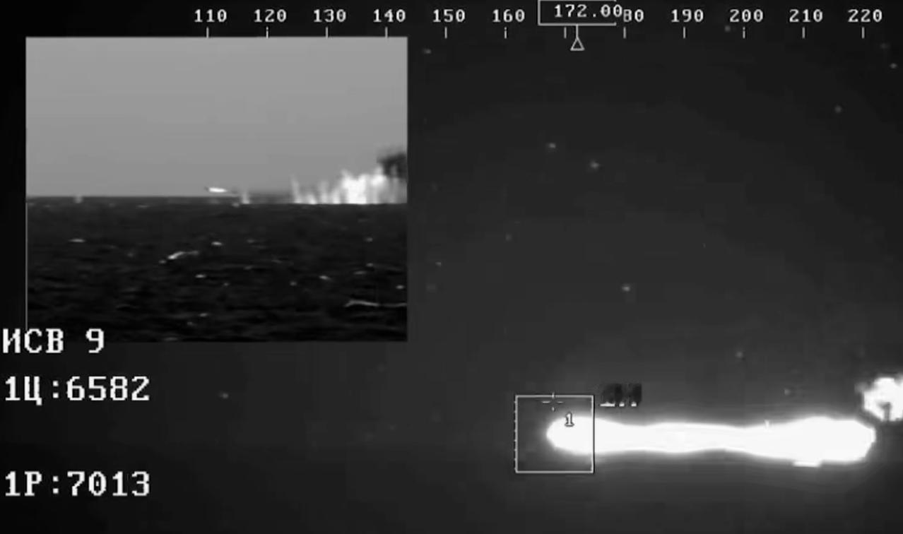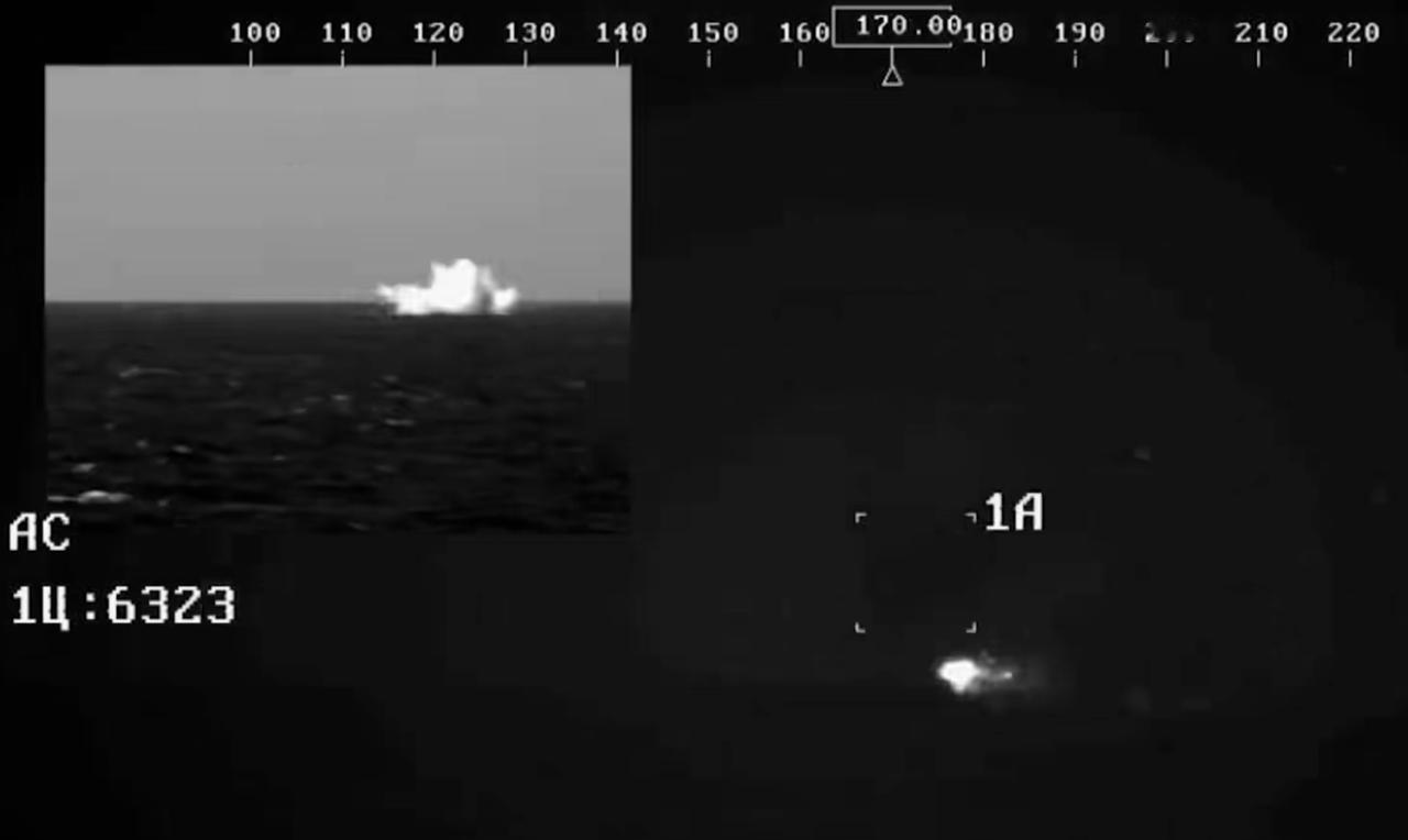 22800型小型导弹舰的“铠甲-M”防空系统使用导弹击落距离海面1.5米飞行的“短号”反坦克导弹靶弹的热成像通道画面。