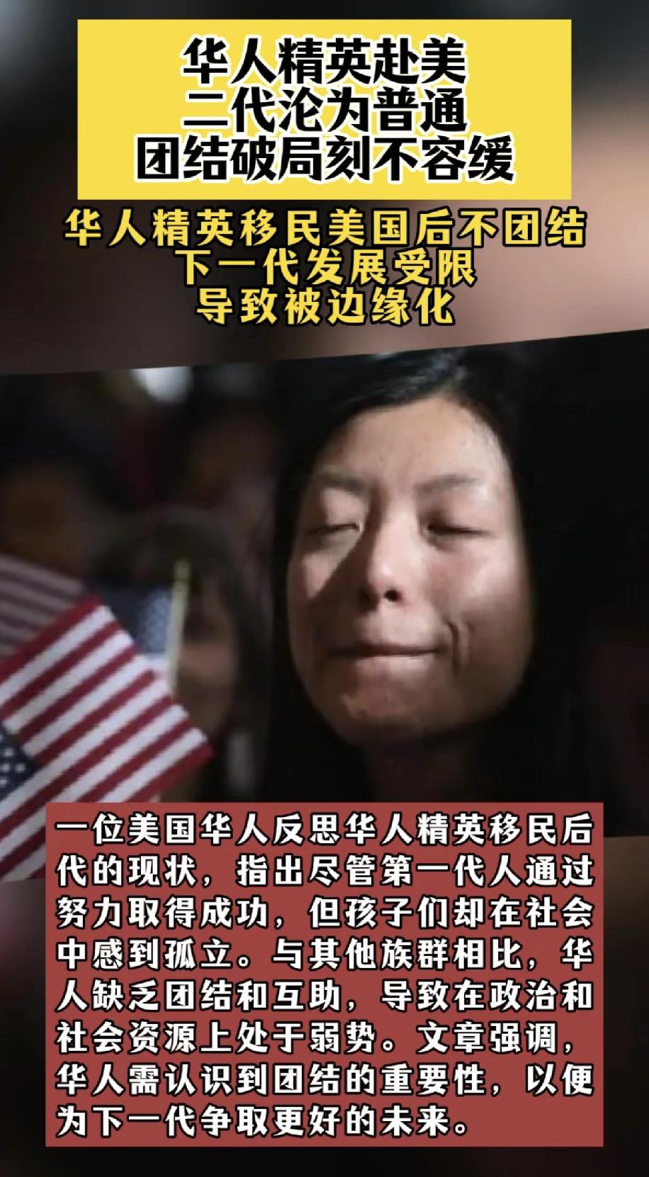 华人精英在美为什么二代而衰,不是没钱 ,也不是扯淡的主动融入当地社会,而是自己不够自立自强。 美洲这块土地实际是无规则可言,每个族群都需要自己立的规则,华人精英不缺知识,更不差钱,但往往要怂头怂脑的去融入别人族群,然后就像猪仔一样主动被阉割,想着的不是自立当人,而是站在别人面前阉割后当千岁,看上去威风,实际别人能把阉割了那玩意的人当回事。 所以,现在华人群体认识到这个问题,他们移民的作用是什么他们没搞明白,就是开拓,而不是融入,要有自己的独立人格。