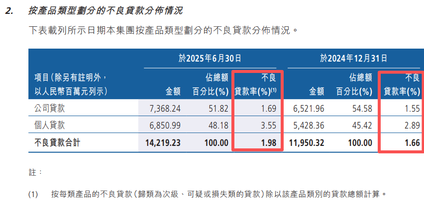 今年上半年,该行不良率为1.98%,几乎逼近2%,成为外界热议话题。相较2024年末的1.66%,不良率上涨了0.32%。同时,该行的拨备覆盖率为169.75%,较2024年末下滑14.59%。