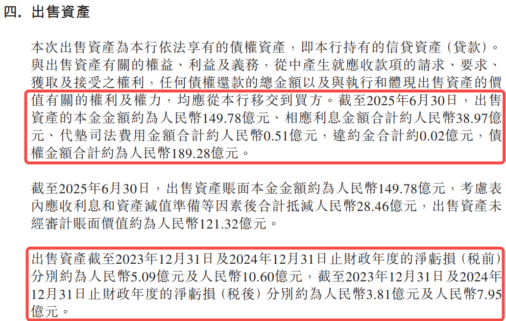 第一次发生在2024年11月,该行公告转让合计约145.92亿元的信贷资产。第二次就是2025年10月刚发布的公告,转让的信贷资产规模更大,合计约189.28亿元。