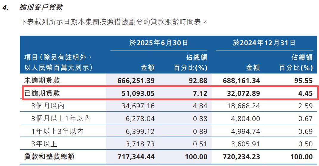 值得注意的是,广州农商行在2025年上半年的逾期贷款达到510.93亿元,较2024年末增加190.2亿元。