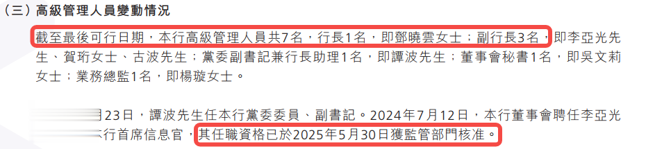 9月,监管核准谭波董事的任职资格,他现任该行党委副书记兼行长助理。